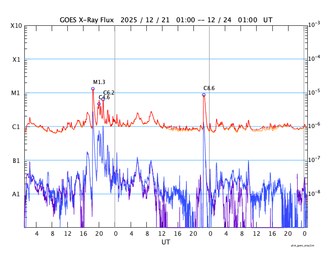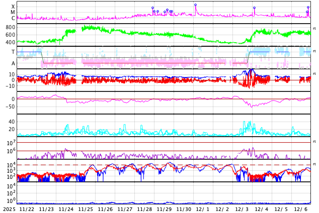 GOES衛星の太陽X線強度。赤・橙 = 0.1〜0.8 nm、青・紫 = 0.05〜0.4 nm (c) データ:NOAA/SWPC、作図:宇宙天気ニュース ![]() | ||||||||||||||||||||||||||||||||||||||||||||||||||||||||||||||||||||||||||||||||||||||||||||||||||||||||||||||||||||||||||||||||||||||||||||||||||||||||||||||||||||||||||||||||||||||||||||||||||||||||||||||||||||||||||||||||||||||||||||||||||||||||