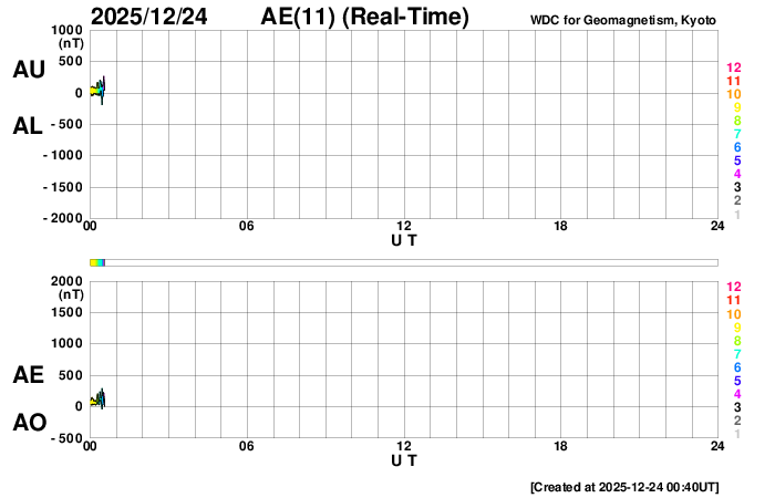 2025/12/24 09:53 更新 高速の太陽風が続き、磁気圏も活動的です。アイスランドのオーロラをどうぞ。 担当 篠原 アイスランドに滞在中の藤井哲也さんと高家幹夫さんより、 現地22日に撮影されたオーロラの写真をいただきました。 太陽風の速度は700km/秒とかなり高く、 AE指数は、22時頃まで700nT程度の中規模の変化が続いていました。 現地は、20時から21時半くらいまで晴れ間があったそうで、 ちょうど良いタイミングで観測できた様です。 光害のほとんどない場所で、月明かりもなく理想的な観測条件だったそうです。 1枚目は晴れてオーロラが見え始めた頃で、2枚目で少し強くなり、 3枚目で一気に激しい輝きが空を覆っています。 4枚目はその1分後とのことで、 短い時間にオーロラの姿が大きく変わる様子が想像できます。 5枚目は、北の空を撮影したもので、 右側に北斗七星、その左に北極星、 上側の真ん中付近にカシオペヤ座が見えています。 山に積もった雪がオーロラに照らされて、 緑色に見えているのがとてもきれいです。 この後、空は雲に覆われてしまったそうです。 最初の頃の写真と比較すると、 太陽風が強まってオーロラの活動が活発になっている様子がとてもよく分かります。 一週間にわたる観測の報告をどうもありがとうございます。 現在の太陽風は、速度が700km/秒から680km/秒へ少し下がっています。 速度がかなり高まっている状態は続いています。 磁場強度は6nT前後で、平均的な状態です。 磁場の南北成分は、弱い南寄りになっています。 磁気圏の活動は活発で、 AE指数は、500〜800nTの中規模の変化が次々に発生しています。 藤井さんの報告の様に、 極域では賑やかなオーロラが続いているのではないでしょうか。 SDO衛星AIA193の太陽コロナ写真を見ると、 高速の太陽風をもたらしているコロナホールは、 西側(右側)の赤道付近から、左下へ向かって南半球の高緯度側に広がり、 その左側では中緯度側へ上がっています。 この左側の広がりは、前周期は見られなかった領域で、 この部分からも影響がやって来ると考えると、 太陽風の強まりは、この後も1週間程度続くかもしれません。 太陽は、X線グラフに目立った変化はなく、 穏やかな状態です。 可視光写真では、黒点が増えて少し賑やかになっています。