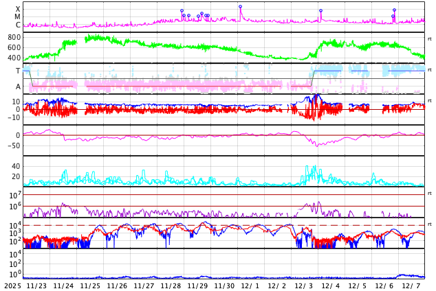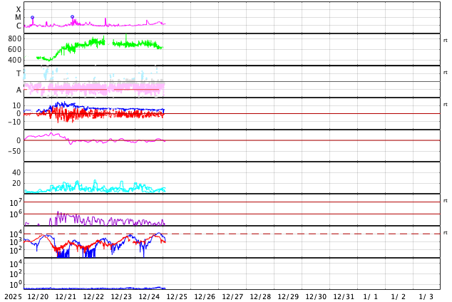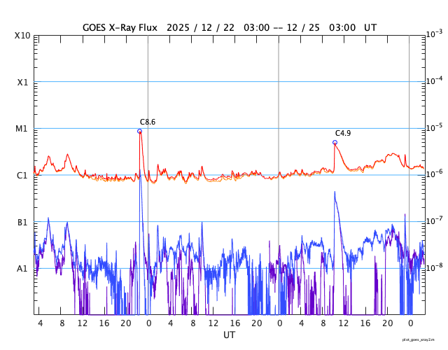 GOES衛星の太陽X線強度。赤・橙 = 0.1〜0.8 nm、青・紫 = 0.05〜0.4 nm (c) データ:NOAA/SWPC、作図:宇宙天気ニュース ![]() | ||||||||||||||||||||||||||||||||||||||||||||||||||||||||||||||||||||||||||||||||||||||||||||||||||||||||||||||||||||||||||||||||||||||||||||||||||||||||||||||||||||||||||||||||||||||||||||||||||||||||||||||||||||||||||||||||||||