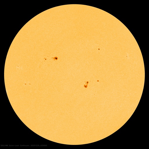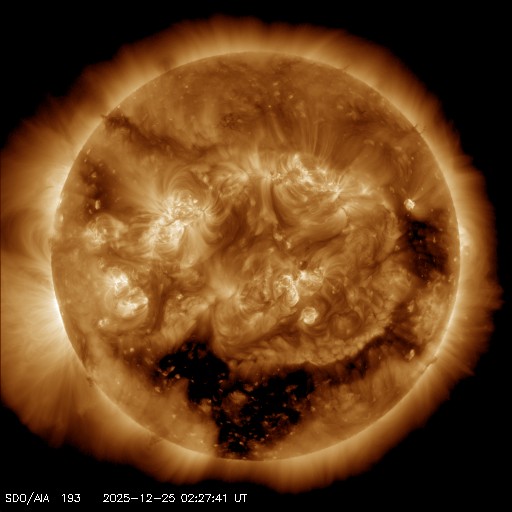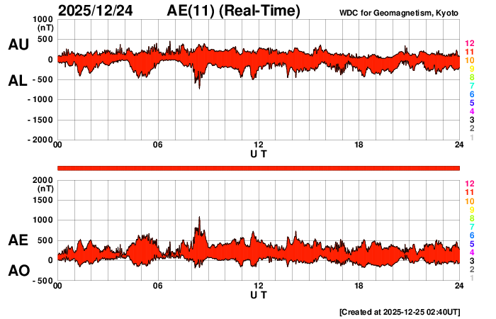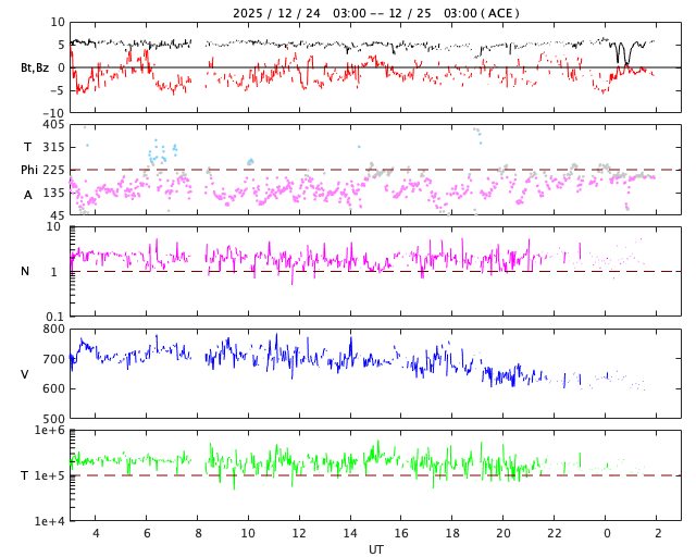 2025/12/25 11:53 更新 太陽風は高速ですが、620km/秒に少し下がっています。 担当 篠原 太陽風の速度は、昨日のニュースの後に再び700km/秒に高まり、 今日に入った頃からゆっくり下がって、 現在は620km/秒くらいです。 高速の状態は続いています。 磁場強度は、5nTと平均的な状態です。 磁場の南北成分は、弱い南寄りの傾向が続いています。 磁気圏の活動は、 規模が少し小さくなっていますが、活発に続いていて、 AE指数は、500nT程度の変化が連続的に発生しています SDO衛星AIA193では、 太陽の南側にコロナホールが大きく広がっています。 この後も5〜6日後くらいまで 太陽風速度の高まりが続くかもしれません。 一方、27日周期の図を見ると、 前周期の速度の高まりは、 3日後に相当する12月1日に終わっています。 この後の太陽風はどの様に推移するでしょうか。 太陽は、中心部北東側(左上)の4317黒点群で C4.9、C2.7の小規模フレアが発生しています。 その他は穏やかです。 ![]() SDO衛星のAIA193カメラによる太陽コロナの様子 (c) SDO (NASA) ![]() SDO衛星による太陽の可視光写真。マウスの矢印を写真に重ねると、黒点番号付きの写真に切り替わります。 (c) SDO (NASA) ![]() ACEが観測した太陽風の磁場(黒線は全体の強度、赤線は南北成分) 磁場の向き、プラズマの密度、速度、温度 (c) データ:NOAA/SWPC、作図:宇宙天気ニュース ![]() AE指数(速報値) 下段のAEグラフの値が高くなると、オーロラ活動が活発化しています。 (c) 京都大学WDC ![]() ![]() 27日の太陽周期に合わせた図 太陽が同じ面を地球に向けていた27日前の変化から、今後を予想することができます。 (c) 作図:宇宙天気ニュース