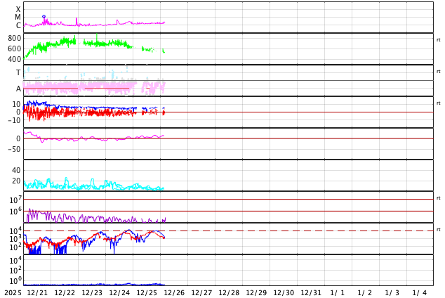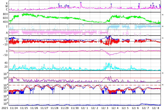 GOES衛星の太陽X線強度。赤・橙 = 0.1〜0.8 nm、青・紫 = 0.05〜0.4 nm (c) データ:NOAA/SWPC、作図:宇宙天気ニュース ![]() | |||||||||||||||||||||||||||||||||||||||||||||||||||||||||||||||||||||||||||||||||||||||||||||||||||||||||||||||||||||||||||||||||||||||||||||||||||||||||||||||||||||||||||||||||||||||||||||||||||||||||||||||||||||||||||||||||||||||||||