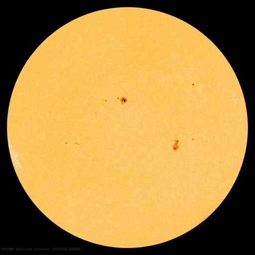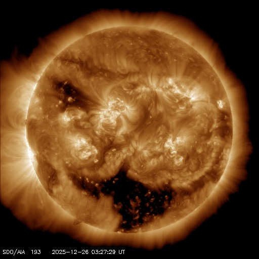 2025/12/26 13:29 更新 太陽風は530km/秒と高速ですが、磁気圏は穏やかです。アイスランドのオーロラをどうぞ。 担当 篠原 アイスランドに滞在中の藤井哲也さんと高家幹夫さんより、 現地25日夜(日本時間は今朝)と、 撮影されたばかりのオーロラ写真をいただきました。 今日の太陽風やAE指数のグラフの中の時間帯で、 速度は550km/秒と高速ですが、 磁場の南北成分は0nT付近と磁気圏への影響は小さかった様で、 AE指数はとても小さい変化が見られる程度です。 送っていただいた写真でも、オーロラの光はとても弱く、 1枚目はほとんど見えず、天の川が空を大きく横切っています。 右上にオリオン座、真ん中の少し左下にカシオペア座が見えています。 2枚目で北の空の低いところに弱いオーロラが現れています。 3枚目は同じ頃に北の空です。 この日は天気が悪く、晴れ間を探して移動しての観測だったそうで、 北の低空は雲に覆われています。 4枚目ではオーロラは弱くなっています。 画像を強調すると、左下の天の川の辺りに赤い光が残っている様です。 23日や24日に紹介した写真と一転して、とても静かな空になっています。 その変化の様子に注目して下さい。 最新情報をどうもありがとうございます。 現在の太陽風は、速度が600km/秒から530km/秒に次第に低下しています。 高速の状態は続いています。 磁場強度は、5〜6nTと平均的な状態です。 磁場の南北成分は0nT付近で小さく変化する程度で、 磁気圏への影響は小さくなっています。 磁気圏の活動は次第に小さくなっていて、 AE指数は、前半は300nTくらいの小規模の変化が続いていますが、 後半は変化が小さくなり、磁気圏は穏やかになっています。 藤井さんの写真は、ちょうどこの頃に撮影されたものです。 SDO衛星AIA193の太陽コロナ写真を見ると、 南半球の高緯度側にコロナホールが大きく広がっています。 緯度が高めですが、この領域の影響がこれから強まる可能性があります。 太陽風の速度が再び高まるかどうか、注目して下さい。 また、北東側(左上)にもコロナホールが見えています。 この領域の広がりはどのくらいでしょうか。 太陽はとても穏やかで、 X線グラフは、小さい変化が見られる程度です。 ![]() アイスランド南部で、現地(世界時)25日22時21分に撮影されたオーロラ。 (c) 藤井哲也氏 ![]() アイスランド南部で、現地(世界時)25日22時41分に撮影されたオーロラ。 (c) 藤井哲也氏 ![]() アイスランド南部で、現地(世界時)25日22時42分に撮影されたオーロラ。 (c) 高家幹夫氏 ![]() アイスランド南部で、現地(世界時)25日22時50分に撮影されたオーロラ。 (c) 藤井哲也氏 ![]() SDO衛星のAIA193カメラによる太陽コロナの様子 (c) SDO (NASA) ![]() SDO衛星による太陽の可視光写真。マウスの矢印を写真に重ねると、黒点番号付きの写真に切り替わります。 (c) SDO (NASA) ![]() ACEが観測した太陽風の磁場(黒線は全体の強度、赤線は南北成分) 磁場の向き、プラズマの密度、速度、温度 (c) データ:NOAA/SWPC、作図:宇宙天気ニュース ![]() AE指数(速報値) 下段のAEグラフの値が高くなると、オーロラ活動が活発化しています。 (c) 京都大学WDC ![]() ![]() 27日の太陽周期に合わせた図 太陽が同じ面を地球に向けていた27日前の変化から、今後を予想することができます。 (c) 作図:宇宙天気ニュース