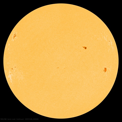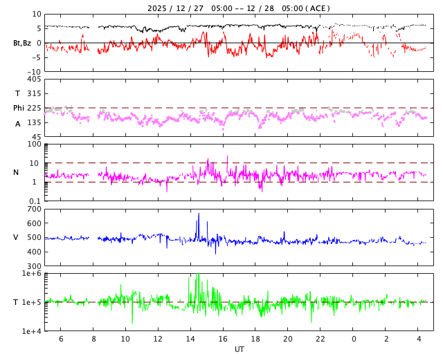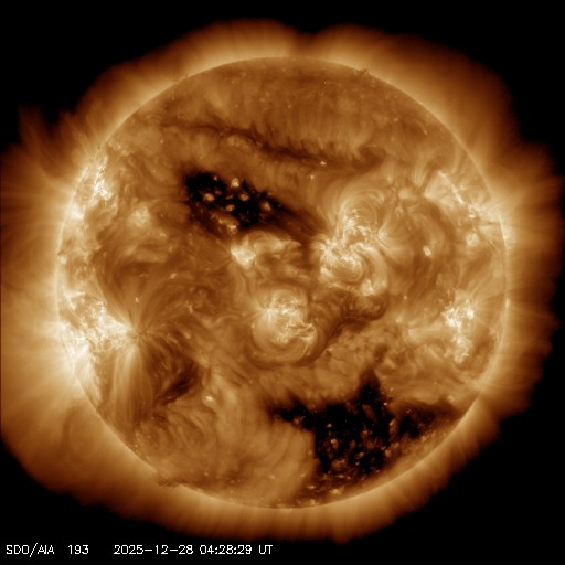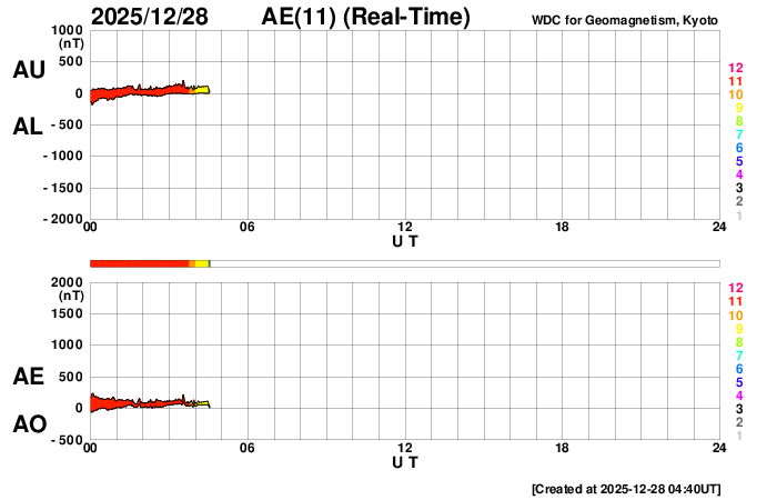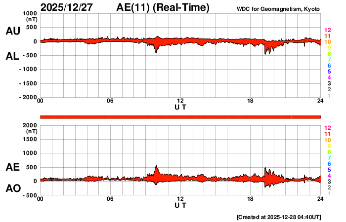 2025/12/28 13:44 更新 太陽風の速度は460km/秒に下がり、高速風は終わっています。アイスランドのオーロラをどうぞ。 担当 篠原 アイスランドに滞在中の藤井哲也さんと高家幹夫さんより、 現地26日深夜に撮影されたオーロラの写真をいただきました。 太陽風の速度は500km/秒と高速の状態が続いていたのですが、 磁場の南向きの変化が小さかった様で、 オーロラの活動はとても弱くなっていました。 AE指数を見ると(昨日のニュースに掲載しています)、 26日は18時以降ほとんど変化がなくなっています。 このため、送っていただいた写真でもオーロラの光は弱く、 北の低空に微かに見えている程度です。 活動が小さい時の現地の様子として、とても参考になります。 2枚目の写真では、右に北斗七星の大きい柄杓、 左にこぐま座の小さい柄杓が見えています。 どちらも真っ直ぐに立っている状態で、 この位置関係で空高く見えるのは、高緯度地域ならではと言えるでしょう。 鹿児島では、この状態では北斗七星の下の方はまだ地面の下です。 3枚目の写真では、 上側の真ん中に南の低空に輝くオリオン座が見えています。 右に見える明かりはレイキャビックの街、 左はケフラビーク国際空港とのことです。 今回も興味深い写真をどうもありがとうございます。 現在の太陽風は、 速度は500km/秒から460km/秒へ少し下がっている様です。 高速の状態は一旦終わっています。 磁場強度は、5〜6nTと平均的な状態です。 磁場の南北成分は、小さく南北に変化しています。 磁気圏へは弱い影響が及んでいる様で、 AE指数は基本的には穏やかですが、 時々、500nT程度の変化が発生しています。 SDO衛星AIA193では、 南半球のコロナホールは南西側(右下)に進んでいます。 今の所、影響は弱まっていますが、この後はどう推移するでしょうか。 一方、北半球のコロナホールは、 先頭(右端)が太陽の中心線に達しています。 3日後くらいからこの領域の影響が始まりそうです。 この領域の影響は前の周期にも到来していて、 27日周期の図を見ると、12月4日から速度が高まっています。 今回は、12月31日頃でしょうか。 年末から新年にかけてオーロラの活動が強まるかもしれません。 太陽は、北西(右上)の4317黒点群で、 C9.8とMクラス寸前の小規模フレアが発生しました。