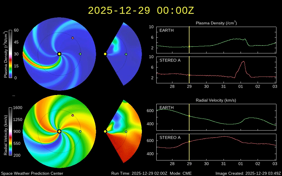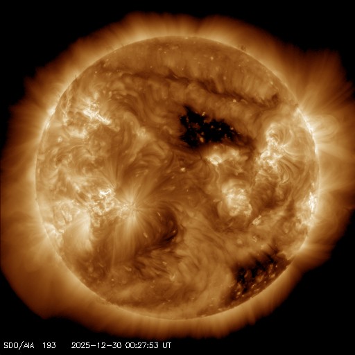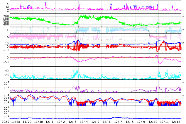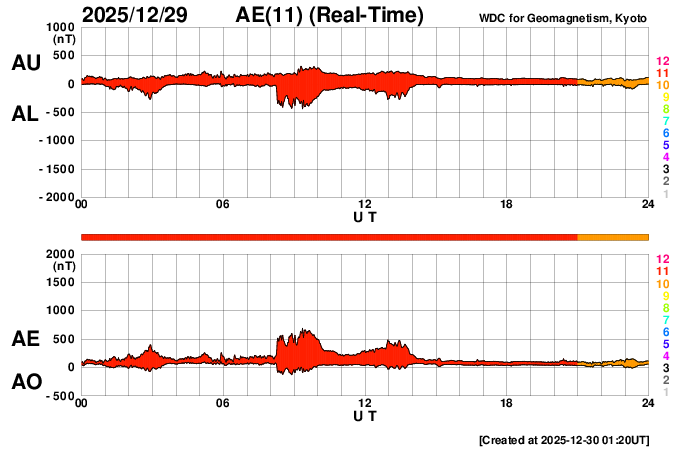 2025/12/30 10:22 更新 太陽風の速度は390km/秒に下がり、やや低速です。磁気圏は穏やかです。 担当 篠原 昨日のニュースで紹介した、太陽の北西(右上)の4317黒点群で 29日7時(世界時28日22時)に発生したM4.2中規模フレアに伴って発生した CME(コロナ質量放出)の動画を掲載します。 これを見ると、コロナのガスは太陽の右上に広がっています。 NOAA/SWPCの太陽風予報では、 CMEは地球に対して斜め方向に飛び出していて、 噴出の端の方が1月1日14時(世界時1日5時)頃に 地球にやって来る可能性があるとのことです。 影響は小さいものになりそうです。 太陽では、その後、北東(左上)の4324群でC8.9の小規模フレア、 南東(左下)の4325群でM1.0の中規模フレアが発生していますが、 X線グラフの後半は変化が少なくなっていて、 活動は落ち着いている様です。 太陽風は、速度が430km/秒から390km/秒へ下がり、 やや低速になっています。 磁場強度は、6〜8nTでゆっくり変化しています。 磁場の南北成分は、 グラフの前半は南寄り、後半はやや北寄りになっています。 AE指数では、前半に500nT前後の小・中規模の変化が起きていますが、 後半は変化がなくなっていて、現在の磁気圏は穏やかです。 SDO衛星AIA193では、 北半球のコロナホールが西側(右側)に進んでいます。 明日くらいから太陽風の速度が高まりそうです。 ![]() 29日7時(世界時28日22時)のM4.2中規模フレアに伴って発生したCME。 (c) SOHO衛星LASCO C2、C3 (ESA & NASA)、(動画加工 : 宇宙天気ニュース) ![]() CMEによる太陽風の乱れは、1月1日14時(世界時1日5時)頃に地球に到来する可能性があります。 (c) WSA-ENLIL太陽風予報 (NOAA)、(動画加工 : 宇宙天気ニュース) ![]() SDO衛星のAIA193カメラによる太陽コロナの様子 (c) SDO (NASA) ![]() SDO衛星による太陽の可視光写真。マウスの矢印を写真に重ねると、黒点番号付きの写真に切り替わります。 (c) SDO (NASA) ![]() GOES衛星の太陽X線強度。赤・橙 = 0.1〜0.8 nm、青・紫 = 0.05〜0.4 nm (c) データ:NOAA/SWPC、作図:宇宙天気ニュース ![]() ACEが観測した太陽風の磁場(黒線は全体の強度、赤線は南北成分) 磁場の向き、プラズマの密度、速度、温度 (c) データ:NOAA/SWPC、作図:宇宙天気ニュース ![]() AE指数(速報値) 下段のAEグラフの値が高くなると、オーロラ活動が活発化しています。 (c) 京都大学WDC ![]() ![]() 27日の太陽周期に合わせた図 太陽が同じ面を地球に向けていた27日前の変化から、今後を予想することができます。 (c) 作図:宇宙天気ニュース