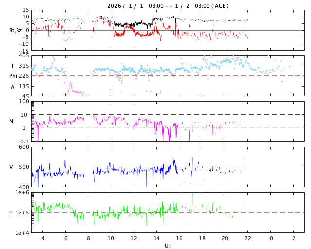 2026/ 1/ 2 12:00 更新 太陽風はやや高速です。C6.2の小規模フレアによりハロー型のCMEが発生しています。 担当 篠原 昨日のニュースの後、太陽風の速度は460km/秒に少し下がり、 その後再び上がって、480km/秒とやや高速の状態に戻っています。 SDO衛星AIA193の太陽コロナ写真を見ると、 北半球のコロナホールは、北東の端(右上)に近付いていて、 今回の太陽風速度の高まりは、この程度で終わりそうです。 27日周期の図を見ると、 前周期の太陽風速度は600km/秒台に高まっていたのですが、 今回はこの高まりがほとんど消えた様になっています。 太陽風の磁場強度は、 10nTに近い状態から、7nT程度へ下がっている様です。 南北成分は、グラフの前半は北寄りですが、 途中から南寄りで変化する様になっています。 磁気圏の活動もこの影響で少し強まっていて、 AE指数は、600nTの中規模の変化が続く様になっています。 SDO衛星AIA193の太陽の中心部にはコロナホールは見られず、 この後、太陽風の速度は低下して、 穏やかな状態がしばらく続きそうです。 太陽では、今日未明、2日2時半(世界時1日17時半)に、 中心部北側(上側)の4324黒点群で、C6.2の小規模フレアが発生しました。 SDO衛星AIA131の動画を掲載します。 この動画では、フレアに伴ってコロナのガスが飛び出す様子が見えています。 GOES衛星CCOR1では、CME(コロナ質量放出)が観測されています。 CMEは、太陽の左上に濃く広がっていますが、 左下や右側にも淡く飛び出す様子が見えていて、 ハロー型のCMEになっている様です。 フレアの発生位置から考えても、 CMEの噴出は地球にも向かっているのではないでしょうか。 到来まで3日くらいかかると考えると、5日の午前中くらいでしょうか。 X線グラフの最後で、C6.5の小規模フレアが発生しています。 太陽の中心部南東側(左下)の黒点群で発生しています。