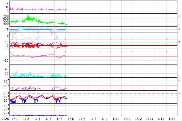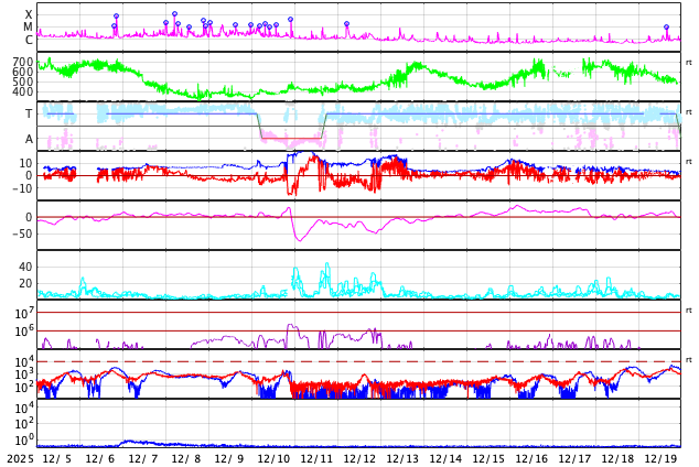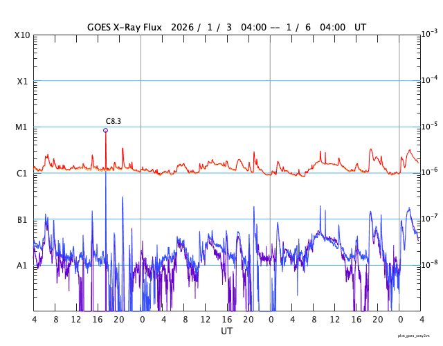 GOES衛星の太陽X線強度。赤・橙 = 0.1〜0.8 nm、青・紫 = 0.05〜0.4 nm (c) データ:NOAA/SWPC、作図:宇宙天気ニュース ![]() | ||||||||||||||||||||||||||||||||||||||||||||||||||||||||||||||||||||||||||||||||||||||||||||||||||||||||||||||||||||||||||||||||||||||||||||||||||||||||||||||||||||||||||||||||||||||||||||||||||||||||||||||||||||||||||||||||||||||||||||||