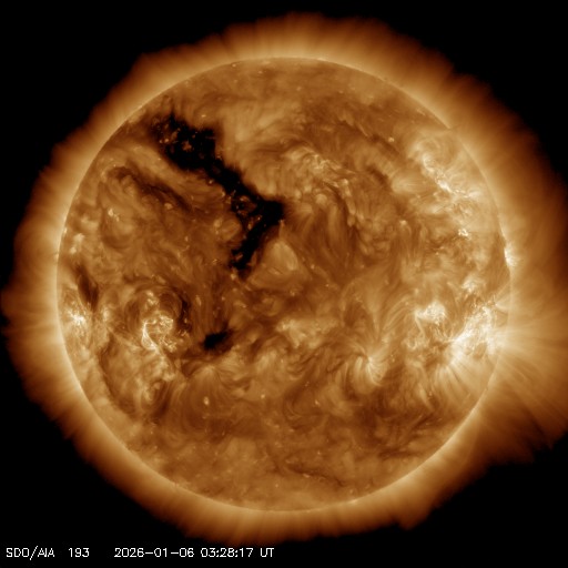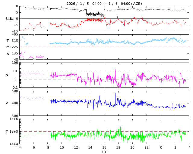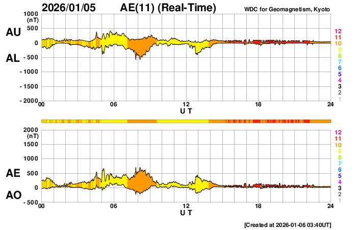 2026/ 1/ 6 12:45 更新 太陽風は低速になっています。フェアバンクスのオーロラをどうぞ。 担当 篠原 臼井元明さんより、アラスカ・フェアバンクスで、 年末に撮影されたオーロラの写真をいただきました。 1枚目は、現地12月28日23時45分(世界時29日8時45分)の撮影で、 太陽風の速度は450km/秒と平均的な状態で、磁場が弱い南向きに変化して、 AE指数では600nTの中規模の変化が発生した頃でした。 フェアバンクスの郊外での撮影とのことで、動きのあるオーロラだったそうです。 雪原が印象的です。 2枚目は、大晦日の未明の現地12月31日1時31分(世界時31日10時31分)。 ちょうどこの頃に、AE指数は700nTの短い時間の強まりが発生していて、 この活動を捉えたのかもしれません。 手前に写っているのは、チェナ温泉入口に展示のアラスカ鉄道車両とのことです。 満月に近く、夜空のコンディションはあまり良くなかったそうですが、 風景が撮影できたので楽しく過ごせたとのことです。 臼井さんからは、2012〜2017年にかけて毎年の様にオーロラの写真をいただいていました。 今回も、2025年最後のオーロラをどうもありがとうございます。 太陽風は、速度が450km/秒から370km/秒に下がり、 低速になっています。 磁場強度は、10nTから7nTに少し下がっています。 磁場の南北成分は、南寄りの傾向が続いています。 AE指数は、グラフの前半は500nTくらいの変化が発生していて、 磁気圏はある程度活動的でした。 しかし、グラフの途中から変化が見られなくなっています。 現在の磁気圏は穏やかになっている様です。 SDO衛星AIA193では、北半球のコロナホールの先頭(右端)が、 太陽の中心線に達したところです。 3日後の9日くらいから、この領域の影響で太陽風の速度が高まる可能性があります。 27日周期の図を見ると、前周期は650km/秒くらいまで高まっています。 今回はどの様な太陽風がやってくるでしょうか。 太陽は、南東(左下)の4334黒点群で、C3.0、C2.1の小規模フレア、 南西(右下)の4333群でC3.3の小規模フレアが発生しています。 全体としては、穏やかな状態です。