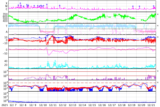 GOES衛星の太陽X線強度。赤・橙 = 0.1〜0.8 nm、青・紫 = 0.05〜0.4 nm (c) データ:NOAA/SWPC、作図:宇宙天気ニュース ![]() | ||||||||||||||||||||||||||||||||||||||||||||||||||||||||||||||||||||||||||||||||||||||||||||||||||||||||||||||||||||||||||||||||||||||||||||||||||||||||||||||||||||||||||||||||||||||||||||||||||||||||||||||||||||||||||||||||||||||||||||||||||||||||||||||