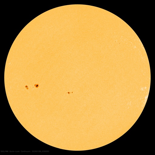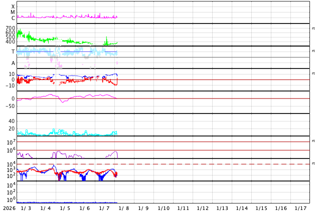 2026/ 1/ 8 12:55 更新 太陽風は低速ですが、磁場が南向きに変化して磁気圏の活動が少し強まっています。 担当 篠原 昨日紹介したSOHO衛星LASCO C2での金星と火星の接近ですが、 現在の画像ではもうすぐ最接近になりそうです。 この1日間の動画を掲載します。 現在、この画像の反対側(地球から見て太陽と反対の方向)には、 木星が位置しています(明後日、10日が衝です)。 すると、火星、金星、太陽、地球、木星の順番で、 5つの天体が真っ直ぐ並んでいることになります。 これに関連して、space weather.comの1月7日のページで、 この惑星の並びと太陽活動との興味深い話題が紹介されています。 (英語のページですが、翻訳サービスを使用するなどしてご覧下さい) 太陽風は、速度は330km/秒から360km/秒へ少し上がっている様ですが、 低速の状態が続いています。 磁場強度は、5nTからゆっくりと上昇して、 現在は10nTに強まっています。 磁場の南北成分は、今日に入った頃から南向きに切り替わり、 グラフの後半では、-10nT近くまで南向きに強まっています。 このため、磁気圏の活動もある程度強まっていて、 AE指数は、途中から小規模の変化が続く様になり、 800nTに達する中規模の変化も発生しています。 太陽風のグラフの最後では、磁場は北向きに急に変化しています。 この後はどの様に変化するでしょうか。 SDO衛星AIA193では、 北半球のコロナホールは、西側(右側)に次第に進んでいます。 明日くらいから太陽風の速度が高まりそうです。 27日周期の図を見ると、 前周期は、12月13〜14日に速度が高まって、一旦下がり、 16日から再び高速太陽風が始まっています。 コロナホールの広がりは、前周期と似た形になっていますが、 太陽風の変化は今回はどうなるでしょうか。 太陽は、中心部南側(下側)の4334黒点群で C7.4と大きめの小規模フレアが発生しています。 その他に、C1〜3の小さい小規模フレアが、 4334群、4337群、4325群などで発生しています。