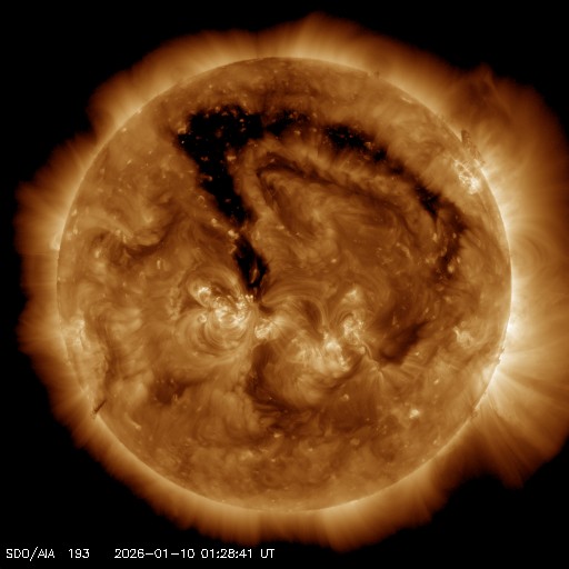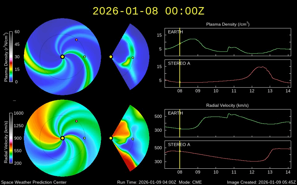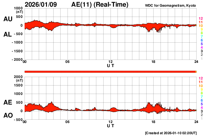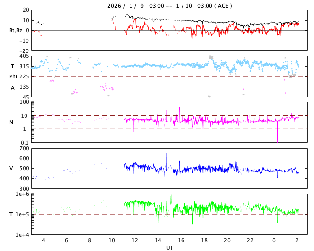 2026/ 1/10 11:30 更新 太陽風の速度は480km/秒と少し高まっています。 担当 篠原 太陽風の速度は、昨日の午後に400km/秒から500km/秒に上がり、 高速の風がやって来ました。 現在は480km/秒くらいで推移していて、やや高速の状態です。 磁場強度は、10nTから8nTへ少し下がっていますが、 やや強まった状態は続いています。 SDO衛星AIA193で北半球側に長く伸びている コロナホールの影響が始まった様です。 コロナホールは太陽の北東側(左上)にかけて広がっていて、 速度の高まりは、5日後くらいまで続きそうです。 これに重なって、昨日紹介した9日未明の CME(コロナ質量放出)による太陽風の乱れが地球に向かっています。 NOAAA/SWPCの予報では、 明日の未明、11日1時(世界時10日16時)頃に到来する可能性があります。 速度の変化は小幅になりそうですが、 磁場の強まりがやって来て、南向きに大きく変化すると、 速度の高まりと重なって、活発なオーロラの活動を起こす可能性があります。 注目して下さい。 現在の磁気圏は、比較的穏やかな状態です。 AE指数は、500nTの変化も発生していますが、 変化の小さい時間が目立っています。 太陽は、中心部南東(左下)の4336黒点群で、 C3.4の小規模フレアが発生した程度で、 X線グラフは変化の少ない状態になっています。 ![]() CMEによる太陽風の乱れは、11日1時(世界時10日16時)頃に到来する可能性があります。 (c) WSA-ENLIL太陽風予報 (NOAA)、(動画加工 : 宇宙天気ニュース) ![]() SDO衛星のAIA193カメラによる太陽コロナの様子 (c) SDO (NASA) ![]() SDO衛星による太陽の可視光写真。マウスの矢印を写真に重ねると、黒点番号付きの写真に切り替わります。 (c) SDO (NASA) ![]() ACEが観測した太陽風の磁場(黒線は全体の強度、赤線は南北成分) 磁場の向き、プラズマの密度、速度、温度 (c) データ:NOAA/SWPC、作図:宇宙天気ニュース ![]() AE指数(速報値) 下段のAEグラフの値が高くなると、オーロラ活動が活発化しています。 (c) 京都大学WDC ![]() ![]() 27日の太陽周期に合わせた図 太陽が同じ面を地球に向けていた27日前の変化から、今後を予想することができます。 (c) 作図:宇宙天気ニュース