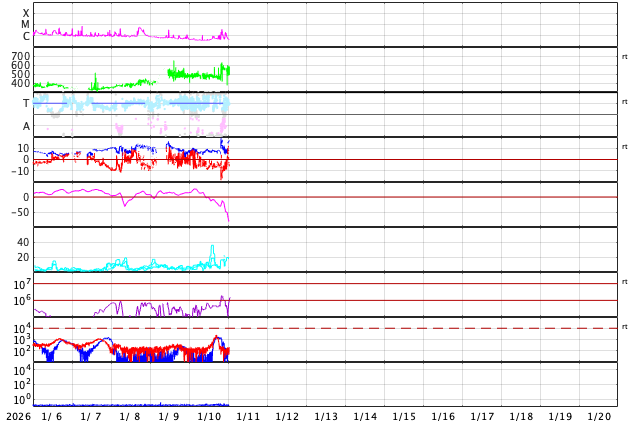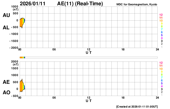 2026/ 1/11 10:05 更新 CMEによる太陽風の乱れが到来しました。磁場が南向きに強まって磁気圏の活動が強まりました。 担当 篠原 9日未明のCME(コロナ質量放出)による太陽風の乱れが、 今朝、11日4時半(世界時10日19時半)にACE衛星で観測され、 太陽風の速度は600km/秒に高まりました。 昨日のニュースの後も、 太陽風の速度は480km/秒とやや高速の状態が続きました。 磁場強度は6〜8nTと少し強まっていたのですが、 磁場の南北成分が10日13時(世界時10日4時)頃から南向きの傾向になり、 -7nT前後の状態が今朝にかけて続きました。 このため、磁気圏の活動は強まって、 AE指数は、グラフの途中から 1000nTに達する大きい変化が連続的に発生しています。 ここにCMEによる太陽風の乱れが到来して、 速度は600km/秒に、磁場強度は15nTに高まりました。 磁場の南北成分は、-10nTと南向きにさらに強まっています。 磁気圏の活動も規模が大きくなって、 AE指数は1500nTに達する激しい変化が発生しています。 乱れの到来から5時間ほど経った現在では、 太陽風の速度は520km/秒と、高速ですが勢いは下がっています。 磁場強度は、一旦7nTに下がりましたが、 グラフの最後で再び15nTに強まっています。 ただし、磁場の南北成分は北向きに変化していて 磁気圏への影響は下がっています。 AE指数もグラフの最後は500nTの変化に下がっています。 CMEによる太陽風の乱れは長くは続かないと思われるので、 太陽風はこの後、到来前の状態に戻って行きそうです。 一方、SDO衛星AIA193では、 北半球を縦に伸びるコロナホールが太陽の中心線付近で見えています。 この広がりの影響が3日後くらいに地球に到来して、 太陽風の速度が高まりそうです。 太陽は、北西の端(右上)近くの4337黒点群で、 C3.8、C2.0の小規模フレアが発生しています。 可視光写真では、東側(左側)に黒点はなく、 太陽は穏やかに推移しそうです。
