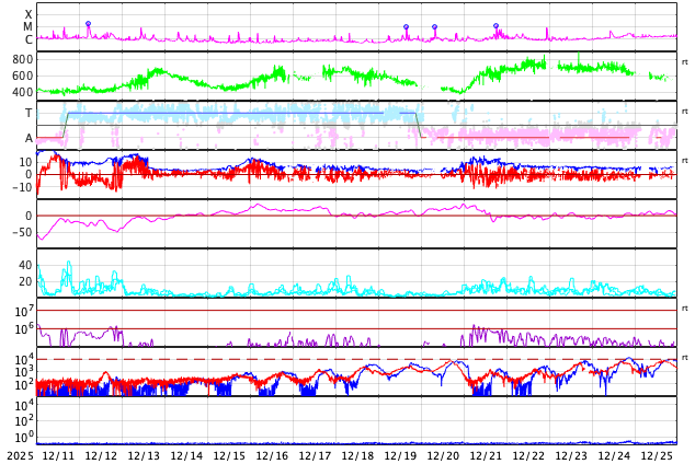 (c) SDO衛星AIA131 (NASA)、(動画加工 : 宇宙天気ニュース) ![]() CMEが太陽の左側へ飛び出しています。 (c) GOES衛星CCOR-1 (NOAA)、(動画加工 : 宇宙天気ニュース) ![]() SDO衛星のAIA193カメラによる太陽コロナの様子 (c) SDO (NASA) ![]() SDO衛星による太陽の可視光写真。マウスの矢印を写真に重ねると、黒点番号付きの写真に切り替わります。 (c) SDO (NASA) ![]() GOES衛星の太陽X線強度。赤・橙 = 0.1〜0.8 nm、青・紫 = 0.05〜0.4 nm (c) データ:NOAA/SWPC、作図:宇宙天気ニュース ![]() ACEが観測した太陽風の磁場(黒線は全体の強度、赤線は南北成分) 磁場の向き、プラズマの密度、速度、温度 (c) データ:NOAA/SWPC、作図:宇宙天気ニュース ![]() AE指数(速報値) 下段のAEグラフの値が高くなると、オーロラ活動が活発化しています。 (c) 京都大学WDC ![]() ![]() 27日の太陽周期に合わせた図 太陽が同じ面を地球に向けていた27日前の変化から、今後を予想することができます。 (c) 作図:宇宙天気ニュース