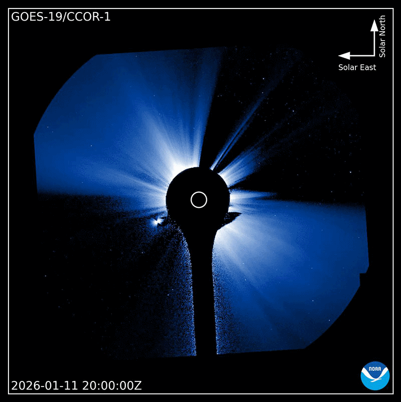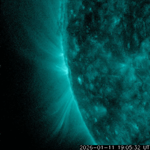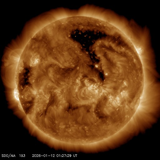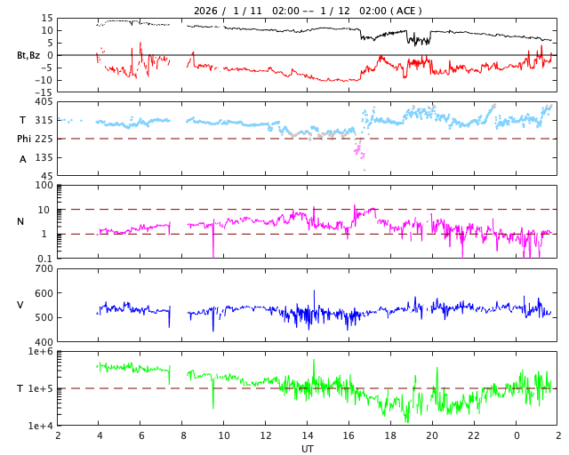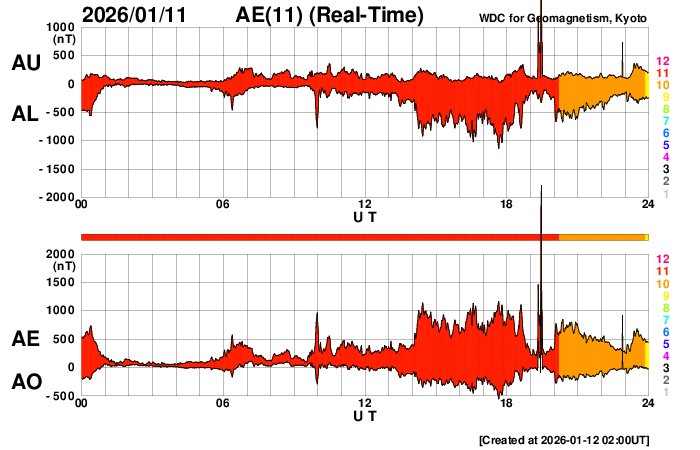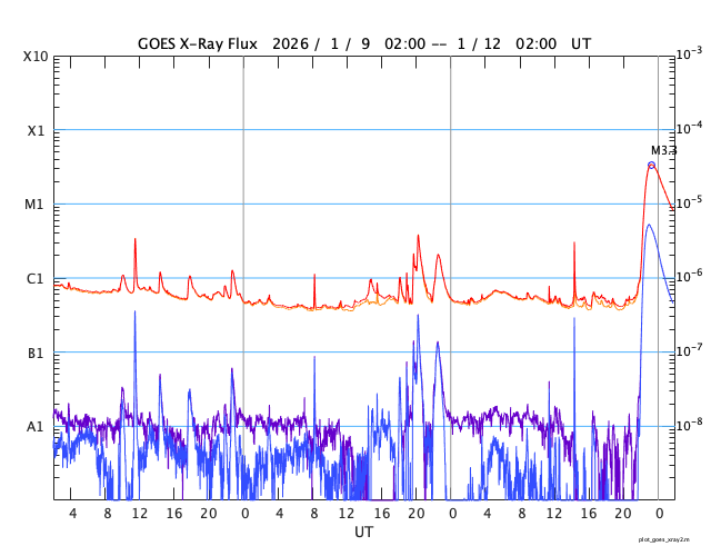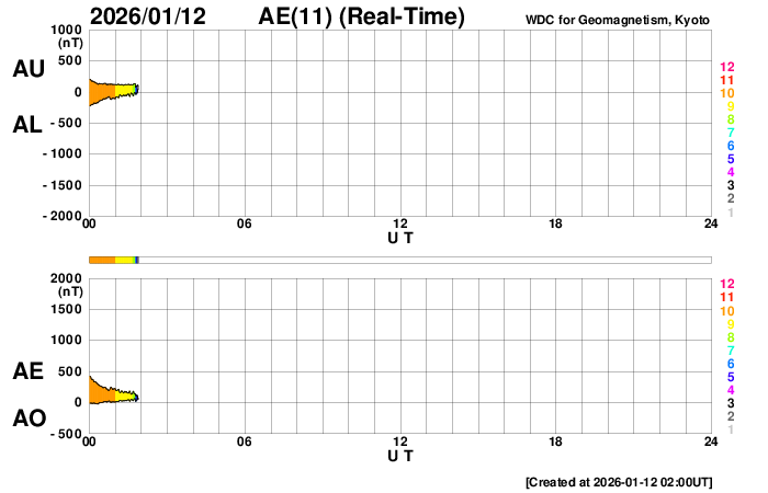 2026/ 1/12 11:00 更新 M3.3の中規模フレアが発生しました。太陽風は高速の状態が続いています。 担当 篠原 今朝、12日6時半(世界時11日21時半)に、 太陽の南東の端(左下)の向こう側でM3.3の中規模フレアが発生しました。 SDO衛星AIA131の動画を掲載します。 また、SDO衛星AIA193の画像でも、 太陽の南東の端に明るい輝きが見えています。 このフレアに伴って、 CME(コロナ質量放出)が太陽の左側に広がっています。 GOES衛星CCOR-1の動画を掲載します。 地球に対して横向きに飛び出しているので、影響はありません。 この後、どのような活動領域が現れるでしょうか。 こちら側へ回って来た後も活発な状態が続けば、 地球へ影響が及ぶ様になります。 注目して下さい。 太陽風は、530km/秒前後の高速の風が続いています。 磁場強度は、14nTから7nTへ下がり、 CME(コロナ質量放出)の影響は終わったと言えそうです。 磁場の南北成分は、昨日のニュース以降も南向きに強まった状態が続き、 -5〜 -10nT程度で推移しました。 磁気圏の活動も活発な状態が続き、 AE指数は500〜1000nTの中規模の変化が続いています。 太陽風のグラフの後半では、 磁場の南北成分は次第に0nTに近付いています。 強度が下がってきたこともあり、 この後は磁気圏の活動は小さくなりそうです。 SDO衛星AIA193では、 北半球のコロナホールの縦の広がりは、西側(右側)に進んでいます。 この領域の影響で、明後日くらいに太陽風が一段強まりそうです。