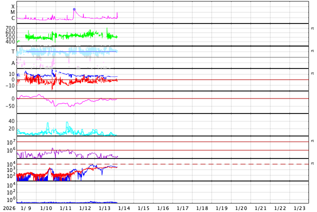 2026/ 1/14 13:35 更新 太陽風は高速の状態が続いています。磁気圏は比較的穏やかです。 担当 篠原 太陽風は、速度が580km/秒から500km/秒へ少し下がっていますが、 高速の状態が続いています。 磁場強度は、上下の変化がありますが、 5〜6nTと平均的な値で推移しています。 磁場の南北成分は、グラフの途中から弱い南寄りになっています。 磁気圏では時々活動が発生していて、 AE指数は、400nTくらいの小規模の変化が時間をおいて発生しています。 全体としては比較的穏やかな状態です。 SDO衛星AIA193では、 北半球のコロナホールは北西側(右上)側にだいぶ進んでいます。 この後、太陽風の強まりが見られるでしょうか。 一方、南東側(左下)にコロナホールの大きい広がりが見えています。 広がりの位置から考えると、速度の高まりは4〜5日後になりそうですが、 27日周期の図の前周期の変化を参考にすると、 もう少し早く、3日後の17日から始まりそうです。 太陽は、東端(左端)の南北から活動的な領域が近づいている様で、 南側では黒点が見え始め、C2.4の小規模フレアが発生しています。 そして、北側ではX線グラフの最後で、 C9.6とMクラス寸前の小規模フレアが発生しました。 この後、どのような領域が現れるでしょうか。 また、太陽では、今朝、14日4時(世界時13日19時)頃に、 北の端の向こう側でプロミネンス噴出が発生しました。 GOES衛星SUVI 304の動画を掲載します。 SOHO衛星LASCO C2では、 CME(コロナ質量放出)も観測されています。 ![]() 太陽の向こう側で発生したプロミネンス噴出。 (c) GOES衛星SUVI 304 (NOAA)、(動画加工 : 宇宙天気ニュース) CMEが太陽の上側に広がっています。 (c) SOHO衛星LASCO C2 (ESA & NASA)、(動画加工 : 宇宙天気ニュース) ![]() SDO衛星のAIA193カメラによる太陽コロナの様子 (c) SDO (NASA) ![]() SDO衛星による太陽の可視光写真。マウスの矢印を写真に重ねると、黒点番号付きの写真に切り替わります。 (c) SDO (NASA) ![]() ACEが観測した太陽風の磁場(黒線は全体の強度、赤線は南北成分) 磁場の向き、プラズマの密度、速度、温度 (c) データ:NOAA/SWPC、作図:宇宙天気ニュース ![]() AE指数(速報値) 下段のAEグラフの値が高くなると、オーロラ活動が活発化しています。 (c) 京都大学WDC ![]() ![]() 27日の太陽周期に合わせた図 太陽が同じ面を地球に向けていた27日前の変化から、今後を予想することができます。 (c) 作図:宇宙天気ニュース