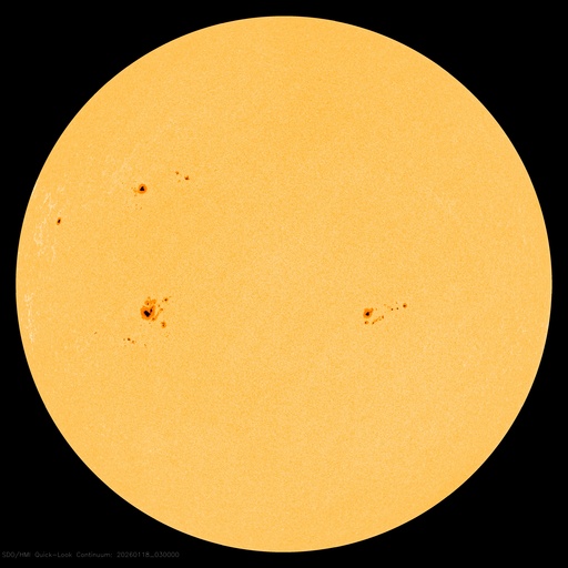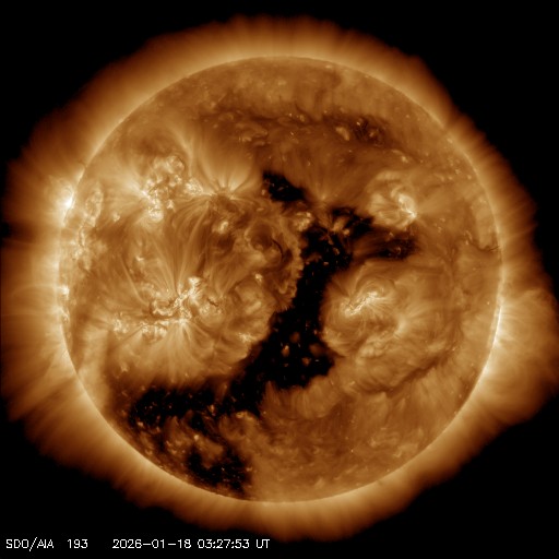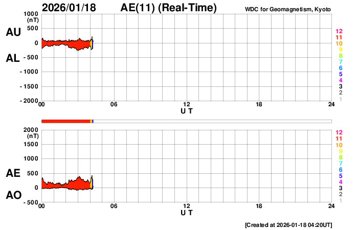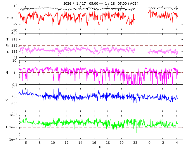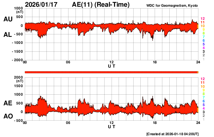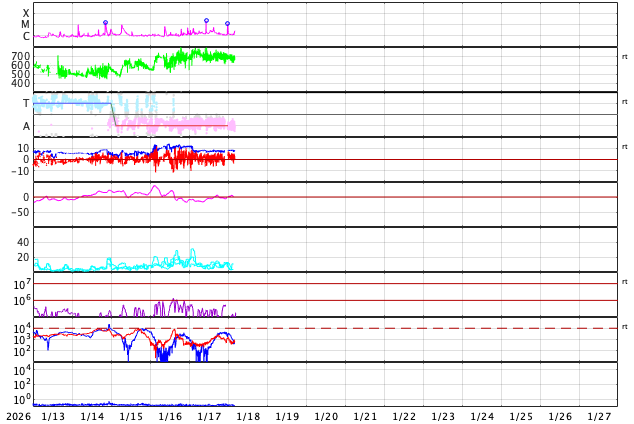 2026/ 1/18 13:26 更新 太陽風は670km/秒と高速です。磁気圏の活動も続いています。 担当 篠原 太陽風の速度は、700km/秒から670km/秒へ少し下がっていますが、 かなり高まった状態は続いています。 磁場強度は、7〜8nTとやや強まった状態です。 磁場の南北成分は、0nTを挟んで南北に細かく変化しています。 磁気圏の活動は、昨日よりは少し小さくなりましたが、 500〜800nTの中規模の変化が続いています。 ただし、太陽風のグラフの最後で 磁場は北寄りの状態がしばらく続いています。 この後もこの傾向が続くと、磁気圏の活動は小さくなりそうです。 SDO衛星AIA193では、 太陽の中心部から南東(左下)に大きく広がるコロナホールが、 太陽の西側(右側)に進んでいます。 太陽風の速度は、この後も大きく高まった状態が続きそうです。 27日周期の図を見ると、 前周期は12月24日まで600km/秒を超える高速風が続いています。 今回はどうなるでしょうか。 太陽は、南東の4341黒点群で、 M2.1、M1.1と中規模フレアが2回発生しています。 この後もフレアが続くでしょうか。