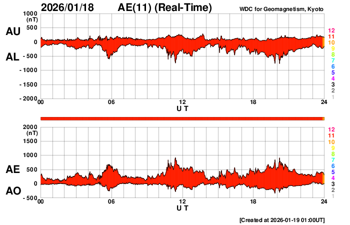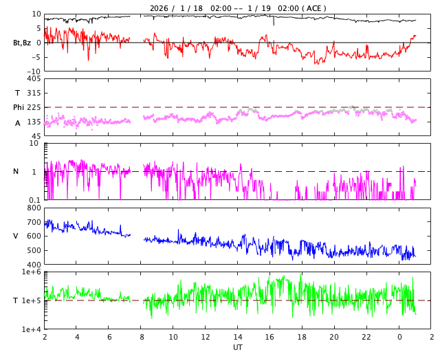 2026/ 1/19 10:13 更新 X1.9の大規模フレアが発生しました。ハロー型のCMEが発生し、太陽風の乱れが地球に向かっています。 担当 篠原 今日未明、19日2時半(世界時18日17時半)に、 太陽中心部南東(左下)の4341黒点群で、 X1.9の大規模フレアが発生しました。 SDO衛星AIA131の動画を掲載します。 Xクラスのフレアの発生は、 12月8日のX1.1以来で、およそ1か月半ぶりです。 X線グラフは、強度の高まりが長く続いています。 この場合はCME(コロナ質量放出)を伴うことが多く、 GOES衛星CCOR-1やSOHO衛星LASCO C2、C3では、 太陽を丸く囲む様に広がるハロー型のCMEが観測されています。 それぞれ動画を掲載します。 GOES衛星CCOR-1では、画面の右下に新月が飛び込んでいます。 また、SOHO衛星LASCO C3(青い写真)では、 太陽の左下に金星、右下の上側に火星、下側に水星が明るく見えています。 フレアは太陽の中心付近で発生しているので、 太陽風の乱れは地球の方向に向かっていると考えられます。 到来まで2日くらいかかると考えると、 明日、20日の夜から明後日、21日の午前中にかけてでしょうか。 速度が高まり、磁場が南向きに大きく変化すると、 磁気圏の活動が激しくなります。 天気が心配ですが、 時間帯が良ければ低緯度オーロラが観測されるかもしれません。 この後発表される、NOAA/SWPCの太陽風予報にも注目して下さい。 引き続き、4341黒点群の活動に注目して下さい。 太陽風は、速度が680km/秒から500km/秒へ下がっています。 高速の状態は続いています。 磁場強度は、8nT前後とやや強まった状態です。 磁場の南北成分は、グラフの途中から南向きに変化しています。 磁気圏の活動は高まった状態が続いて、 AE指数は、500〜800nTの中規模の変化が連続的に発生しています。 SDO衛星AIA193では、 コロナホールが太陽の西側(右側)に進んでいて、 この領域の影響が本格化しそうです。 今回は、この高速風に重なる形でCMEの乱れがやって来るので、 太陽風の乱れはより大きくなるかもしれません。 注目して下さい。 ![]() 4341黒点群で発生した、X1.9の大規模フレア。 (c) SDO衛星AIA131 (NASA)、(動画加工 : 宇宙天気ニュース) ![]() 太陽を丸く囲む様に広がるハロー型のCMEが発生しました。 (c) GOES衛星CCOR-1 (NOAA)、(動画加工 : 宇宙天気ニュース) ![]() CMEが大きく広がっています。 (c) SOHO衛星LASCO C2、C3 (ESA & NASA)、(動画加工 : 宇宙天気ニュース) ![]() SDO衛星のAIA193カメラによる太陽コロナの様子 (c) SDO (NASA) ![]() SDO衛星による太陽の可視光写真。マウスの矢印を写真に重ねると、黒点番号付きの写真に切り替わります。 (c) SDO (NASA) ![]() GOES衛星の太陽X線強度。赤・橙 = 0.1〜0.8 nm、青・紫 = 0.05〜0.4 nm (c) データ:NOAA/SWPC、作図:宇宙天気ニュース ![]() ACEが観測した太陽風の磁場(黒線は全体の強度、赤線は南北成分) 磁場の向き、プラズマの密度、速度、温度 (c) データ:NOAA/SWPC、作図:宇宙天気ニュース ![]() AE指数(速報値) 下段のAEグラフの値が高くなると、オーロラ活動が活発化しています。 (c) 京都大学WDC ![]() ![]() 27日の太陽周期に合わせた図 太陽が同じ面を地球に向けていた27日前の変化から、今後を予想することができます。 (c) 作図:宇宙天気ニュース