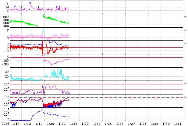 GOES衛星の太陽X線強度。赤・橙 = 0.1〜0.8 nm、青・紫 = 0.05〜0.4 nm (c) データ:NOAA/SWPC、作図:宇宙天気ニュース ![]() GOES衛星による、静止衛星軌道における高エネルギー陽子の変化 (c) データ:NOAA/SWPC、作図:宇宙天気ニュース ![]() | |||||||||||||||||||||||||||||||||||||||||||||||||||||||||||||||||||||||||||||||||||||||||||||||||||||||||||||||||||||||||||||||||||||||||||||||||||||||||||||||||||||||||||||||||||||||||||||||||||||||||||||||||||||||||||||||||||||||||||||||||||||||||||||||||||||||||||||||||||||||||
