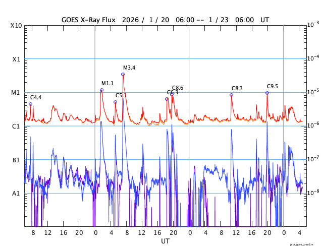 GOES衛星の太陽X線強度。赤・橙 = 0.1〜0.8 nm、青・紫 = 0.05〜0.4 nm (c) データ:NOAA/SWPC、作図:宇宙天気ニュース ![]() | |||||||||||||||||||||||||||||||||||||||||||||||||||||||||||||||||||||||||||||||||||||||||||||||||||||||||||||||||||||||||||||||||||||||||||||||||||||||||||||||||||||||||||||||||||||||||||||||||||||||||||||||||||||||||||||||||||||||||||||||||||||||||||||||||||||||||||||||||||||||||||