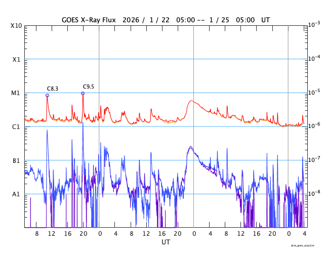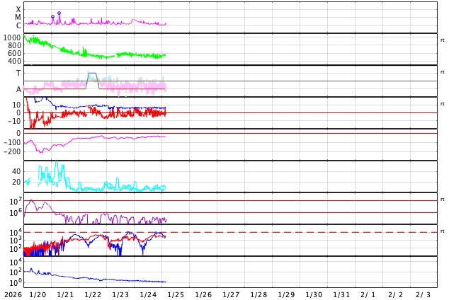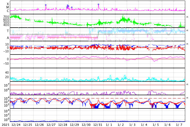 GOES衛星の太陽X線強度。赤・橙 = 0.1〜0.8 nm、青・紫 = 0.05〜0.4 nm (c) データ:NOAA/SWPC、作図:宇宙天気ニュース ![]() | ||||||||||||||||||||||||||||||||||||||||||||||||||||||||||||||||||||||||||||||||||||||||||||||||||||||||||||||||||||||||||||||||||||||||||||||||||||||||||||||||||||||||||||||||||||||||||||||||||||||||||||||||||||||||||||||||||||||||||||||||||||||||||||||||||||||||||||||