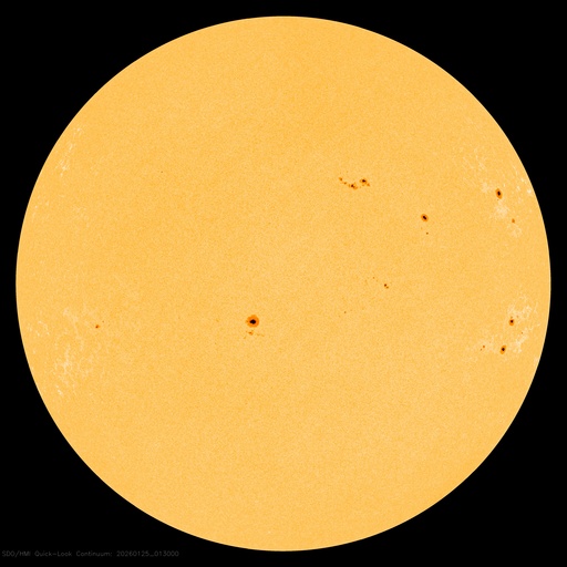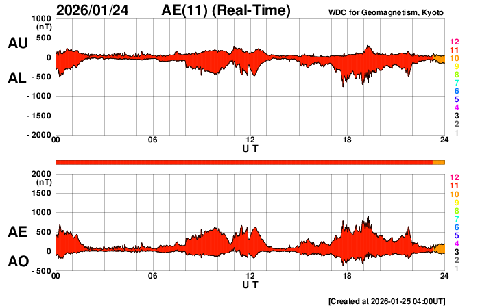 2026/ 1/25 13:17 更新 太陽風は高速の状態が続いています。磁気圏んはやや活動的です。 担当 篠原 太陽風は、500〜550km/秒と高速の状態が続いています。 磁場強度は、6〜7nTと平均的な値で推移しています。 磁場の南北成分は、 南寄りになったり北寄りになったりしています。 磁気圏の活動も、700nT前後の中規模の変化が発生したり、 変化がなくなったりと、強弱が切り替わっています。 SDO衛星AIA193では、 南半球のコロナホールは南西の端(右下)へ進んでいます。 影響は次第に弱まりそうです。 一方、中心部の北側(上側)に小さいコロナホールが見えています。 3日後くらいからこの領域の影響が到来しそうです。 太陽風速度の高まりはどの程度になるでしょうか。 昨日の早い時間帯になりますが、 24日3時(世界時23日18時)頃と、24日7時(世界時23日22時)頃に、 太陽の南東側(左下)へ飛び出すCME(コロナ質量放出)が発生しました。 SOHO衛星LASCO C、C3とGOES衛星CCOR-1の動画を掲載します。 GOES衛星SUVIカメラの動画を見ると、 1つめのCMEは太陽の向こう側で発生した様に思われます。 2つめは南東の端でプロミネンス噴出が発生していて、 GOES衛星SUVI 304の動画を掲載します。 太陽は、C2〜4の小規模フレアが数回発生した程度で、 穏やかな状態です。 ![]() 太陽の南東側で発生した2つのCME. (c) SOHO衛星LASCO C2、C3 (ESA & NASA)、(動画加工 : 宇宙天気ニュース) ![]() GOES衛星による同じCMEの動画。 (c) GOES衛星CCOR-1 (NOAA)、(動画加工 : 宇宙天気ニュース) ![]() 2つめのCMEの頃に発生したプロミネンス噴出。 (c) GOES衛星SUVI 304 (NOAA)、(動画加工 : 宇宙天気ニュース) ![]() SDO衛星のAIA193カメラによる太陽コロナの様子 (c) SDO (NASA) ![]() SDO衛星による太陽の可視光写真。マウスの矢印を写真に重ねると、黒点番号付きの写真に切り替わります。 (c) SDO (NASA) ![]() ACEが観測した太陽風の磁場(黒線は全体の強度、赤線は南北成分) 磁場の向き、プラズマの密度、速度、温度 (c) データ:NOAA/SWPC、作図:宇宙天気ニュース ![]() AE指数(速報値) 下段のAEグラフの値が高くなると、オーロラ活動が活発化しています。 (c) 京都大学WDC ![]() ![]() 27日の太陽周期に合わせた図 太陽が同じ面を地球に向けていた27日前の変化から、今後を予想することができます。 (c) 作図:宇宙天気ニュース