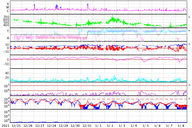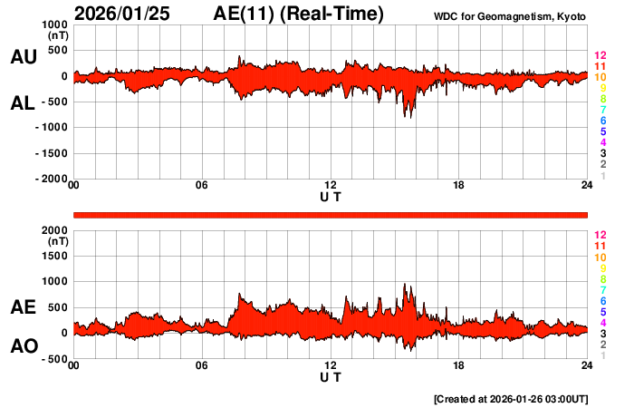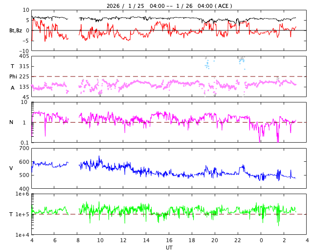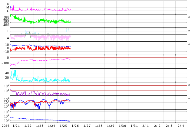 - 2026/ 1/25 13:17 太陽風は高速の状態が続いています。磁気圏んはやや活動的です。