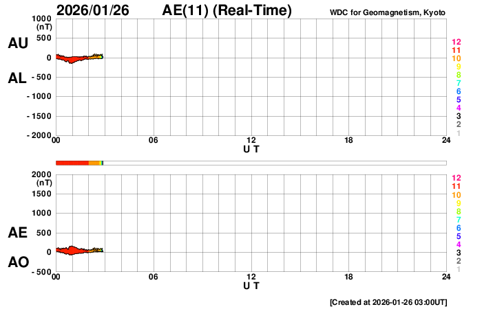 下段のAEグラフの値が高くなると、オーロラ活動が活発化しています。