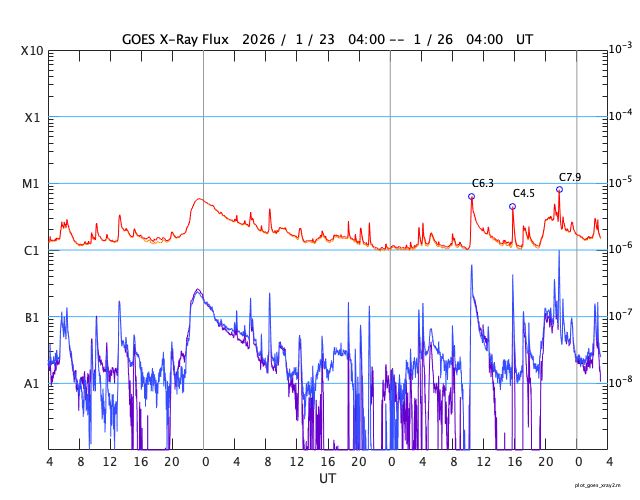 GOES衛星の太陽X線強度。赤・橙 = 0.1〜0.8 nm、青・紫 = 0.05〜0.4 nm