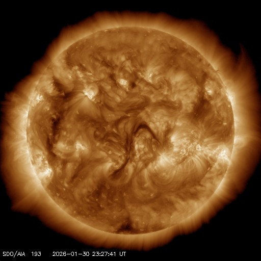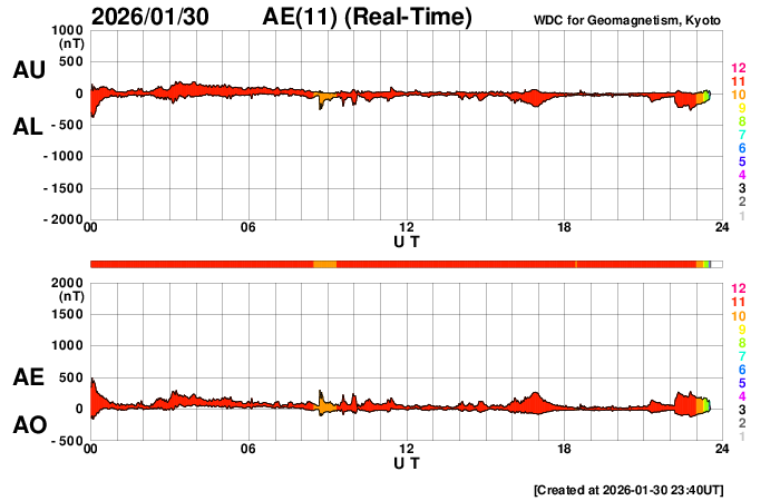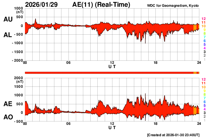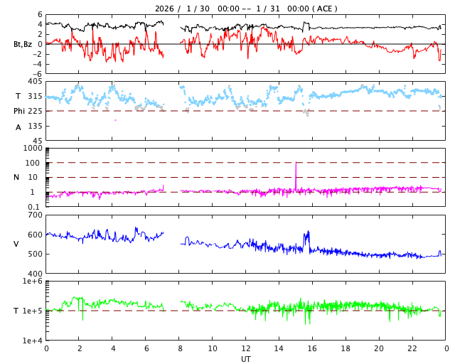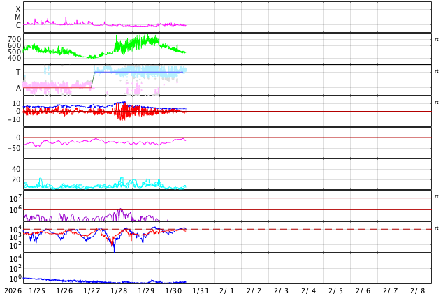 2026/ 1/31 08:59 更新 太陽風の速度は490km/秒に下がり、高速風は終わりそうです。磁気圏は穏やかです。 担当 篠原 太陽風の速度は、昨日のニュース以降も低下が続き、 600km/秒から490km/秒へゆっくり下がっています。 高速風の領域は通り過ぎて行きそうです。 磁場強度は4nTから3nTへ下がり、やや弱い状態です。 磁場の南北成分は、0nT付近で南北に細かく変化しています。 磁気圏は穏やかになっていて、 AE指数は小規模の変化が時々発生する程度です。 SDO衛星AIA193では、太陽の中心部にコロナホールは見られず、 太陽風はしばらく穏やかな状態になりそうです。 27日周期の図の前周期の太陽コロナ写真を見ると、 1月4日頃から北東側(左上)にコロナホールが現れています。 そろそろこの領域が見え始めて良い頃ですが、 現在はどの様になっているでしょうか。 太陽は、北東の端に新しい黒点が現れ、 小さい活動が度々発生しています。 規模が大きくなる様であれば注目して下さい。 X線グラフは、C1の小さい活動が起きている程度で、 全体としては穏やかです。