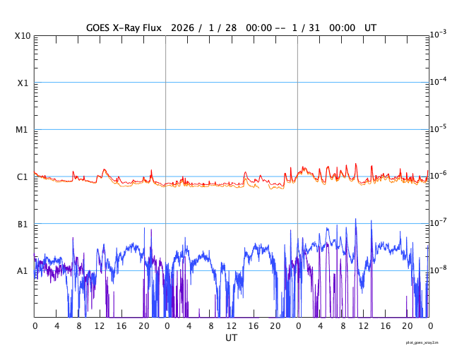 GOES衛星の太陽X線強度。赤・橙 = 0.1〜0.8 nm、青・紫 = 0.05〜0.4 nm (c) データ:NOAA/SWPC、作図:宇宙天気ニュース ![]() | ||||||||||||||||||||||||||||||||||||||||||||||||||||||||||||||||||||||||||||||||||||||||||||||||||||||||||||||||||||||||||||||||||||||||||||||||||||||||||||||||||||||||||||||||||||||||||||||||||||||||||||||||||||||||||||||||||||||||||||||