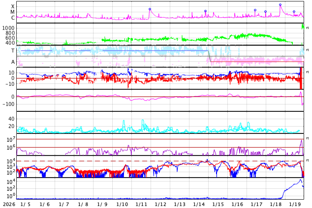 GOES衛星の太陽X線強度。赤・橙 = 0.1〜0.8 nm、青・紫 = 0.05〜0.4 nm (c) データ:NOAA/SWPC、作図:宇宙天気ニュース ![]() | ||||||||||||||||||||||||||||||||||||||||||||||||||||||||||||||||||||||||||||||||||||||||||||||||||||||||||||||||||||||||||||||||||||||||||||||||||||||||||||||||||||||||||||||||||||||||||||||||||||||||||||||||||||||||||||||||||||||||||||||||||||||||||||||||||||||||||||||||||||||||||||||||||||||||||||||||||||||||||||||||||||||||||||||||||||||||||||||||||||||||