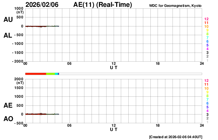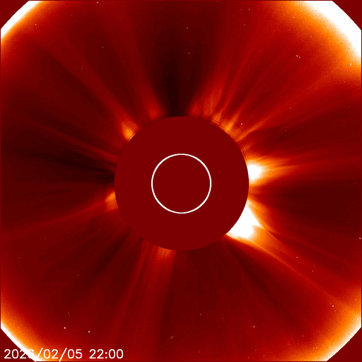 2026/ 2/ 6 13:59 更新 太陽風の速度は600km/秒に高まりました。太陽の向こう側でCMEが発生しています。 担当 篠原 太陽風の速度は、昨日のニュースの後も高まり続け、 500km/秒の状態から、今朝には600km/秒へ高まっています。 現在は少し下がって580km/秒ですが、高速の風が続いています。 これだけしっかりと高まると、CME(コロナ質量放出)というよりも、 コロナホールの様な高速風の吹き出し口が関係している様に思います。 太陽風の磁場強度は、15nTと強まった状態から、 現在は6〜7nTと平均的な値に下がっています。 磁場の南北成分は、 昨日のニュースのすぐ後に北向きに切り替わっていて、 磁気圏活動の強まりはあまり長く続きませんでした。 以降は北寄りの状態で、磁気圏は穏やかになっています。 AE指数は、初めのところに活動の強まりが発生していますが、 その後は変化が小さくなっています。 SDO衛星AIA193では、 北半球の高緯度側にコロナホールが見えています。 緯度が高いですが、影響はどうなるでしょうか。 太陽の向こう側で、ある程度規模の大きい活動が発生した様で、 今朝、6日8時(世界時5日23時)頃に、 太陽の左上に大きく広がるCMEが発生しています。 SOHO衛星LASCO C2、GOES衛星CCOR-1の動画を掲載します。 太陽の北西(右上)の4366黒点群は、 M1〜2の中規模フレアが7回ほど発生しています。 活発な状態は続いていますが、フレアの規模は小さくなっています。 また、南西(右下)の4362群の活動が強まっていて、 昨夜から、C6.0、M1.8、M2.2と、 小規模、中規模のフレアを起こす様になっています。