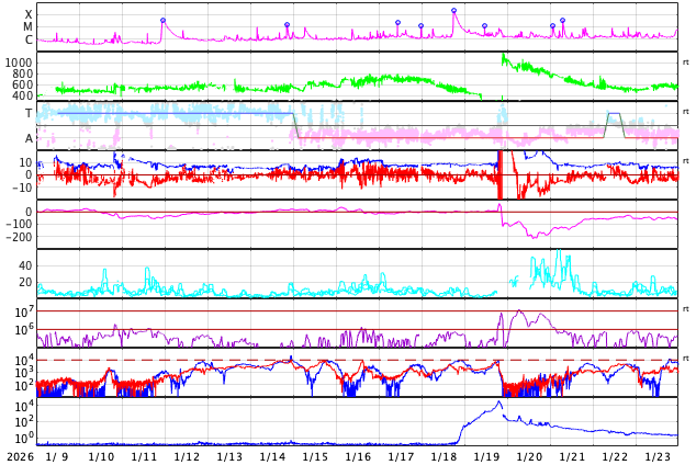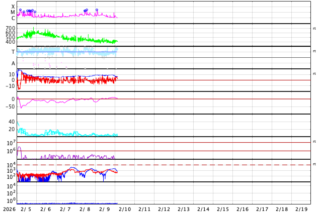 GOES衛星の太陽X線強度。赤・橙 = 0.1〜0.8 nm、青・紫 = 0.05〜0.4 nm (c) データ:NOAA/SWPC、作図:宇宙天気ニュース ![]() | ||||||||||||||||||||||||||||||||||||||||||||||||||||||||||||||||||||||||||||||||||||||||||||||||||||||||||||||||||||||||||||||||||||||||||||||||||||||||||||||||||||||||||||||||||||||||||||||||||||||||||||||||||||||||||||||||||||||||||||||||||||||||||||||||||||||||||||||||||||||