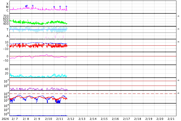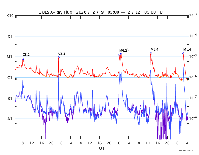 GOES衛星の太陽X線強度。赤・橙 = 0.1〜0.8 nm、青・紫 = 0.05〜0.4 nm (c) データ:NOAA/SWPC、作図:宇宙天気ニュース ![]() | ||||||||||||||||||||||||||||||||||||||||||||||||||||||||||||||||||||||||||||||||||||||||||||||||||||||||||||||||||||||||||||||||||||||||||||||||||||||||||||||||||||||||||||||||||||||||||||||||||||||||||||||||||||||||||||||||||||||||||||||||||||||||||||||||||||
