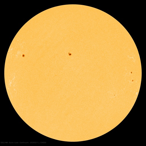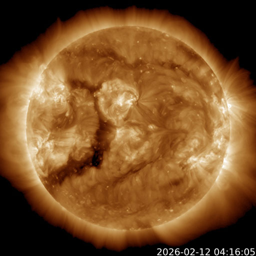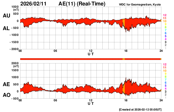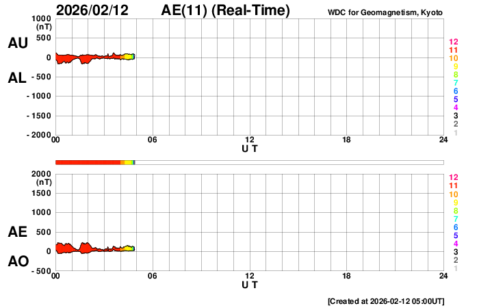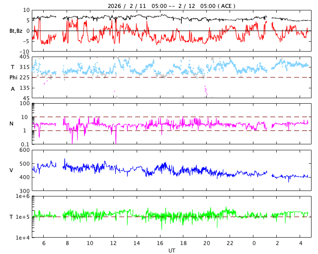 2026/ 2/12 14:00 更新 太陽風は平均的な状態です。磁場が南寄りになり、磁気圏の活動がある程度強まりました。 担当 篠原 太陽風の速度は、昨日のニュースの後に480km/秒へ上がりましたが、 その後は次第に低下して、現在は400km/秒です。 磁場強度も、小幅ですが7nTから5nTに下がっています。 どちらも平均的な状態です。 磁場の南北成分は、南寄りで推移していたため、 AE指数は、500〜800nTの中規模の変化が発生していて、 ある程度活動的な状態が続きました。 太陽風のグラフの最後では、南北成分は0nT付近に変わっている様です。 AE指数の変化も、後半は小さくなっています。 SDO衛星の画像が停止しているので、 GOES衛星SUVI 195の画像を掲載します。 南東側(左下)のコロナホールは、 1〜2日くらいで太陽の中心線に達しそうです。 その3日後と考えると、4〜5日後くらいから、 この領域の影響で太陽風の速度が高まるかもしれません。 コロナホールは、南東の端へ長く伸びているので、 影響も長く続く可能性があります。 太陽は、北西の端(右上)の向こう側へ進んだ4366黒点群で、 昨夜、11日22時(世界時11日13時)にM1.4、 今日の昼、12日11時半(世界時12日2時半)にM1.4と、 中規模フレアが2回観測されています。 太陽の向こう側で発生しているので、 本当の規模はこれよりも大きかったかもしれません。 SDO衛星の更新が停止しているので、 掲載している可視光写真は、昨夜の画像です。