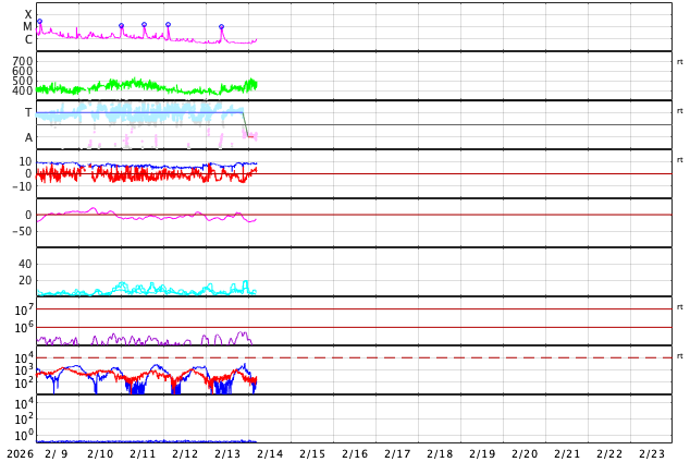 GOES衛星の太陽X線強度。赤・橙 = 0.1〜0.8 nm、青・紫 = 0.05〜0.4 nm (c) データ:NOAA/SWPC、作図:宇宙天気ニュース ![]() | ||||||||||||||||||||||||||||||||||||||||||||||||||||||||||||||||||||||||||||||||||||||||||||||||||||||||||||||||||||||||||||||||||||||||||||||||||||||||||||||||||||||||||||||||||||||||||||||||||||||||||||||||||||||||||||||