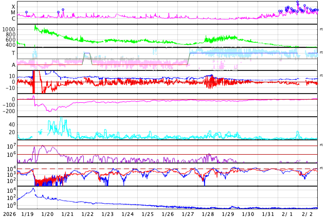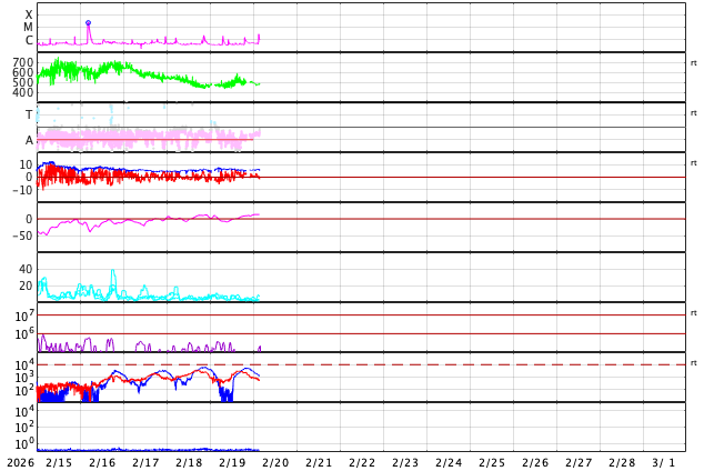 - 2026/ 2/15 13:38 太陽風の速度が600km/秒に高まり、磁気圏の活動も強まっています。
