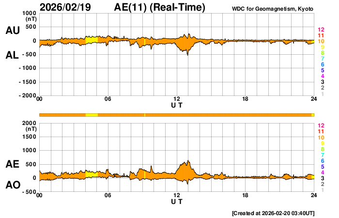 下段のAEグラフの値が高くなると、オーロラ活動が活発化しています。