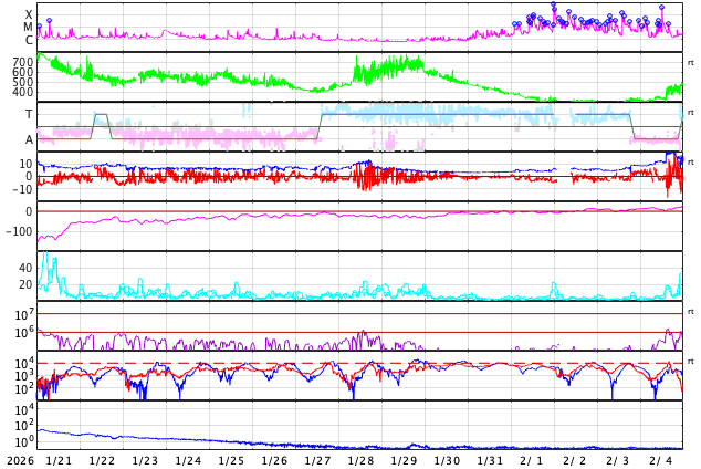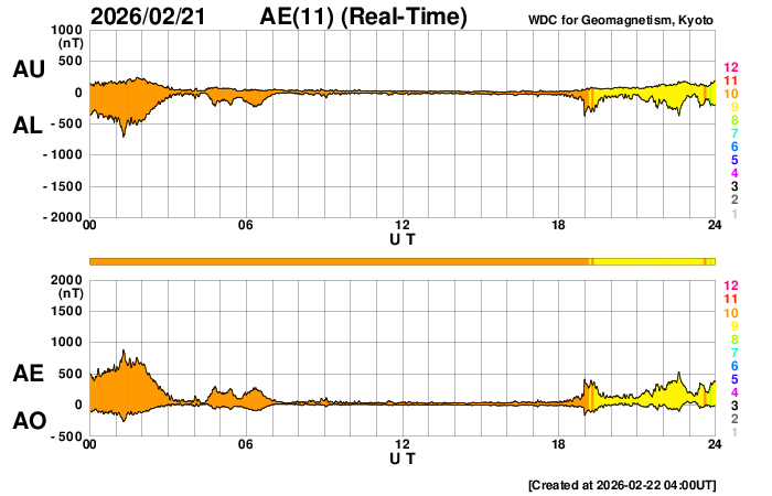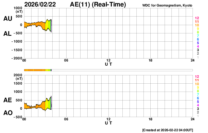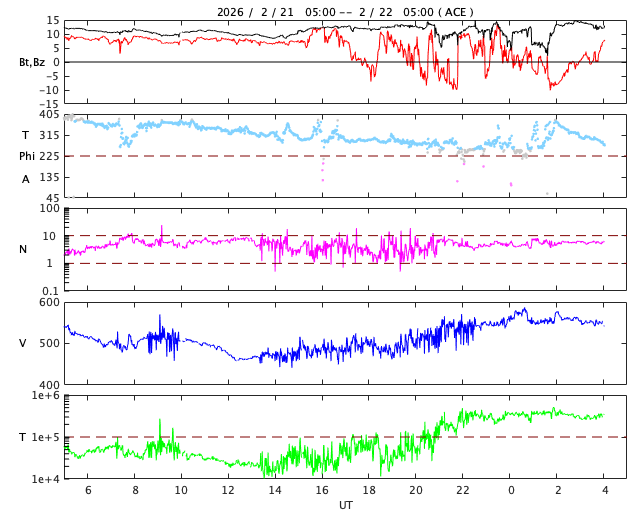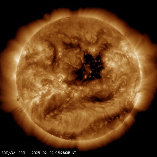 2026/ 2/22 13:12 更新 太陽は無黒点に近い状態です。高速の太陽風が続いています。 担当 篠原 太陽は、北西の端(右上)にあった4374黒点群が 向こう側に進んで見えなくなり、 無黒点に近い状態になっています。 それでも、SDO衛星の可視光写真を拡大すると、 小さい黒点が所々に見えている様で、 掲載の写真では、 中心部南東側(左下)に小さい点を見つけることができます。 WDC-SILSOの記録としては、今日の黒点相対数はどうなるでしょうか。 X線グラフでは、C1の小さいフレアが発生しています。 北西の端に沈んだ4374群で起きています。 太陽風は、速度が500km/秒から550km/秒に高まり、 より高速になっています。 磁場強度も10〜15nTと強まった状態です。 磁場の南北成分は、前半は北向きでしたが、 途中から南北に大きく変化する様になっています。 磁気圏の活動も、穏やかな状態からやや強まった状態に変わっていて、 AE指数は、変化のない時間帯が半日ほど続いた後、 500nTくらいの小、中規模の変化が続くようになっています。 SDO衛星AIA193では、北半球のコロナホールが西側(右側)に進んでいます。 1〜2日後くらいから、この領域の影響が強まりそうです。