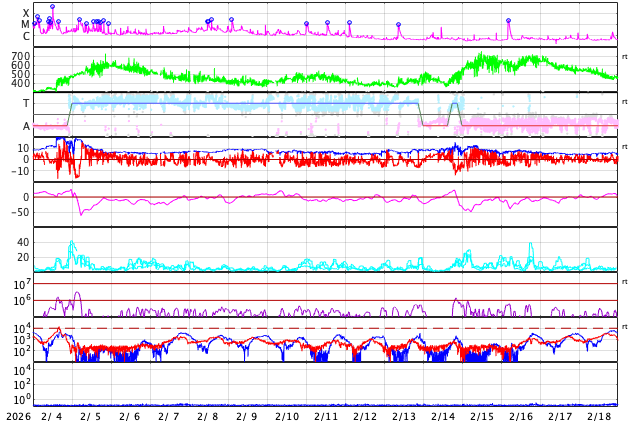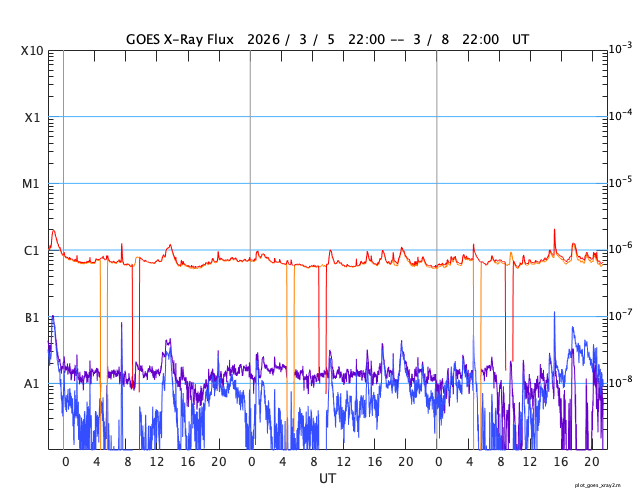 GOES衛星の太陽X線強度。赤・橙 = 0.1〜0.8 nm、青・紫 = 0.05〜0.4 nm (c) データ:NOAA/SWPC、作図:宇宙天気ニュース ![]() | ||||||||||||||||||||||||||||||||||||||||||||||||||||||||||||||||||||||||||||||||||||||||||||||||||||||||||||||||||||||||||||||||||||||||||||||||||||||||||||||||||||||||||||||||||||||||||||||||||||||||||||||||||||||||||||||