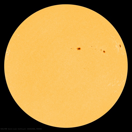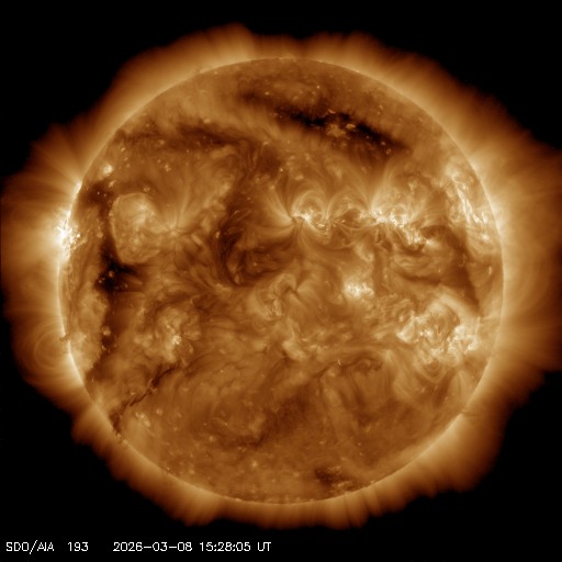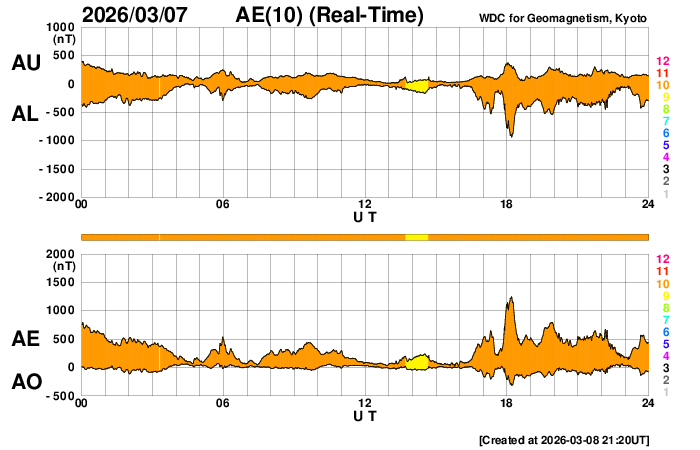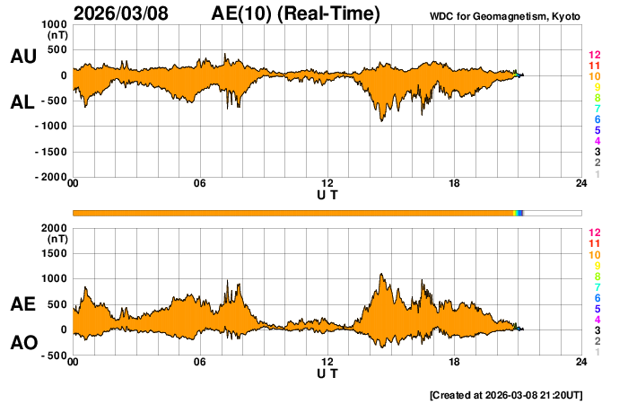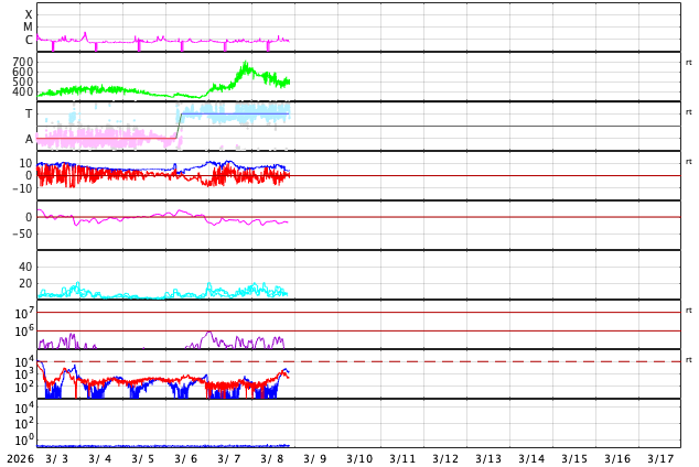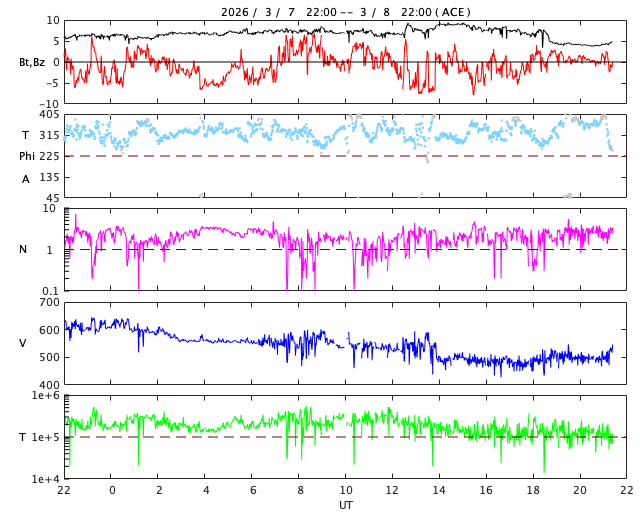 2026/ 3/ 9 06:33 更新 太陽風は高速ですが、速度は下がっています。磁気圏は活動的です。 担当 篠原 8日の朝に650km/秒に高まった太陽風の速度は、 昼頃までこの状態が続きましたが、 その後はゆっくりと低下して、 昨夜遅くに500km/秒へ下がり、現在もこの状態です。 高速の状態は続いていますが、この後はどの様に変化するでしょうか。 磁場強度は、5nTと平均的な状態から、 ゆっくりと9nTに強まって、その後4nTへ戻っています。 南北成分は、-5nT程度の南向きの変化が度々発生していて、 速度の高まりもあって、磁気圏の活動は強まっています。 AE指数は、500〜1000nTの中規模の変化が続いています。 現在は太陽風の速度や磁場強度が下がって来たので、 この後の活動は規模が小さくなりそうです。 SDO衛星AIA193を見ると、 北西側(右上)の高緯度域にコロナホールが見えています。 緯度が高めですが、太陽風速度の高まりは続くでしょうか。 注目して下さい。 太陽は穏やかな状態が続いています。 北東の端(左上)に新しい黒点群が現れていて、 C2.0の小規模フレアを起こしています。 種子島ロケットコンテストは7日と8日に競技が行われて、 工夫を凝らしたたくさんのロケットやCanSatたちが、 種子島宇宙センターの空や大地を駆け巡りました。 鹿児島高専からは6チームが出場しましたが、 それぞれうまくいった部分と失敗した部分があって、 競技としては良い成績を残せませんでしたが、沢山の学びがありました。 これが種子島ロケットコンテストの魅力です。 今日は交流会で他チームの素晴らしい技術を 学ばせてもらいたいと思っています。