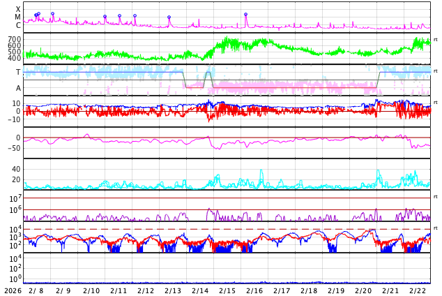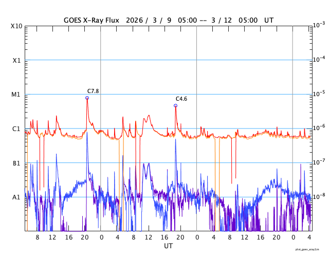 GOES衛星の太陽X線強度。赤・橙 = 0.1〜0.8 nm、青・紫 = 0.05〜0.4 nm (c) データ:NOAA/SWPC、作図:宇宙天気ニュース ![]() | |||||||||||||||||||||||||||||||||||||||||||||||||||||||||||||||||||||||||||||||||||||||||||||||||||||||||||||||||||||||||||||||||||||||||||||||||||||||||||||||||||||||||||||||||||||||||||||||||||||||||||||||||||||||||||||||||||||||||||||||||||||||