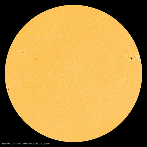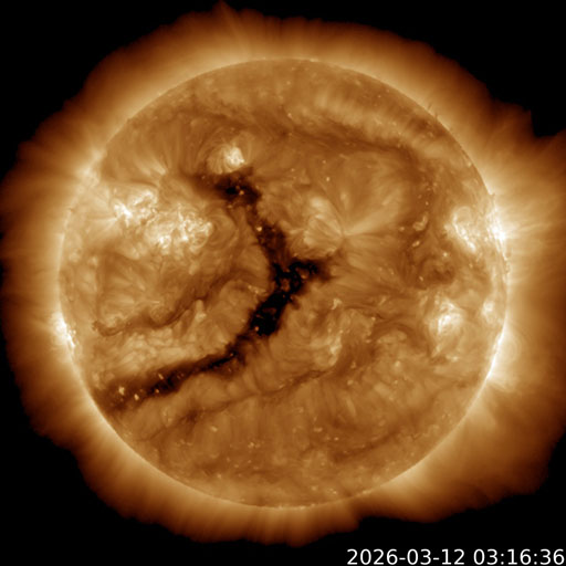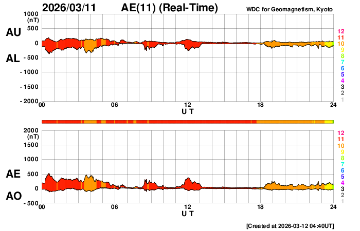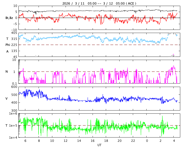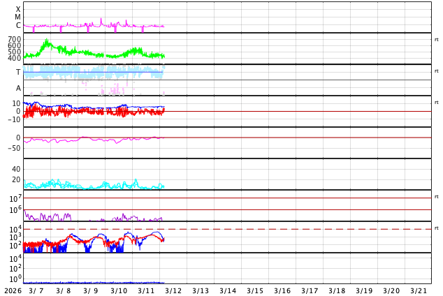2026/ 3/12 13:50 更新 太陽風の速度は450km/秒と平均的な状態に戻っています。 担当 篠原 500km/秒台に高まっていた太陽風の速度は、 昨夕に450km/秒に下がり、以降この状態が続いています。 磁場強度は、6nTで安定しています。 どちらも平均的な値です。 磁場の南北成分は、グラフの前半は0nT付近、 後半は弱い南寄りになっています。 磁気圏への影響は限定的で、 AE指数は、200〜300nTの小規模の変化が発生する程度です。 GOES衛星SUVI 195の太陽コロナ写真では、 コロナホールが太陽の中心部で縦に細長く伸びて、 南東の端(左下)へ向かっています。 見えている位置から考えると、 コロナホールの影響は3日後くらいから始まりそうです。 一方、27日周期の図を参照すると、 前周期の太陽風は 2日後に相当する2月15日から高速風に変わっています。 今回はどのような変化になるでしょうか。 太陽は、可視光写真では黒点があちこちに見えていますが、 活動は穏やかです。 X線グラフはほとんど変化のない状態です。