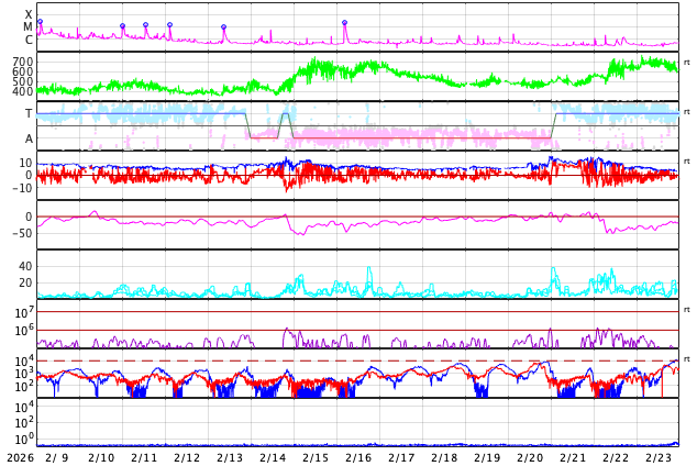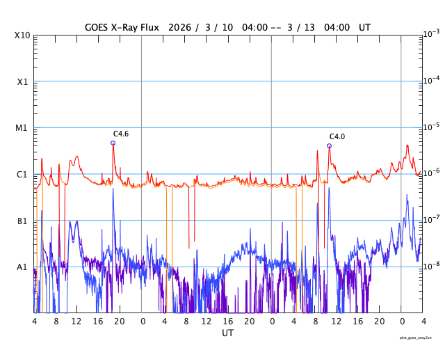 GOES衛星の太陽X線強度。赤・橙 = 0.1〜0.8 nm、青・紫 = 0.05〜0.4 nm (c) データ:NOAA/SWPC、作図:宇宙天気ニュース ![]() | |||||||||||||||||||||||||||||||||||||||||||||||||||||||||||||||||||||||||||||||||||||||||||||||||||||||||||||||||||||||||||||||||||||||||||||||||||||||||||||||||||||||||||||||||||||||||||||||||||||||||||||||||||||||||||||||||||||||||||||||||