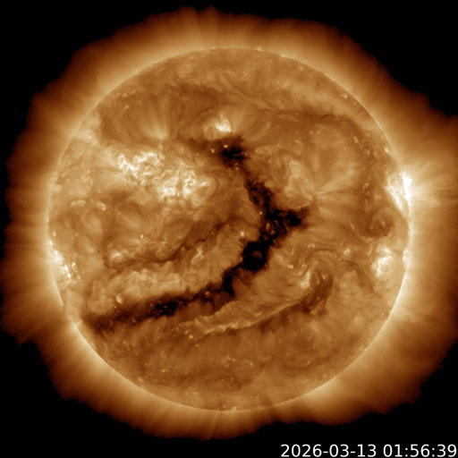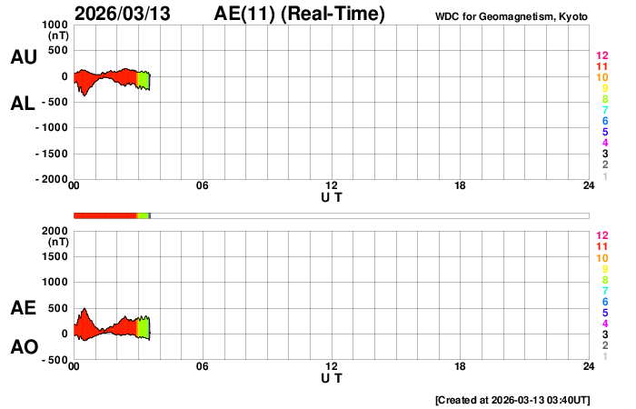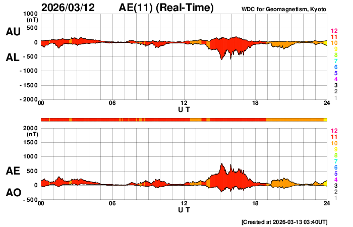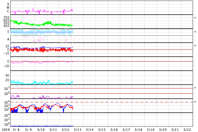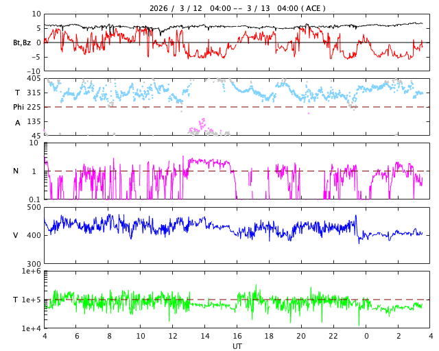 2026/ 3/13 12:42 更新 太陽風は平均的な状態です。太陽でフィラメント噴出が発生しました。 担当 篠原 太陽風の速度は、450km/秒から400km/秒へ少し下がっています。 平均的な状態です。 磁場強度も5〜6nTで安定しています。 磁場の南北成分は、南向きに少し強まる変化が発生しています。 磁気圏の活動もこれに対応して、 AE指数が700nTに強まる変化が発生しています。 GOES衛星SUVI 195では、 細長いコロナホールの右側が、太陽の西側(右側)に進んでいます。 明日か明後日くらいから太陽風の速度が高まりそうです。 前周期の太陽風は650km/秒くらいまで高まっています。 注目して下さい。 太陽の南側で、今朝、13日7時(世界時12日22時)頃に、 フィラメント噴出が発生しました。 GOES衛星SUVI 304の動画を掲載します。 CME(コロナ質量放出)が発生していると思いますが、 噴出は下に向かっている様なので、地球への影響は小さそうです。 また、南東(左下)の4392黒点群でC3.2、 北西の4384群でC4.0、 北西の端でC4.3などの小規模フレアが発生しています。 別々の場所で発生していることもあり、 太陽全体で見ると穏やかな印象です。
