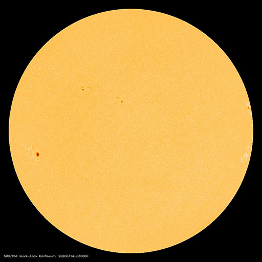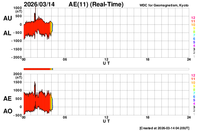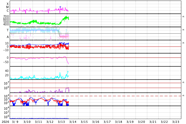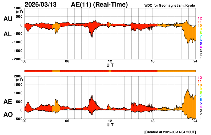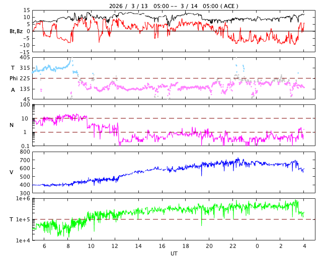 2026/ 3/14 13:20 更新 高速の太陽風が到来して、速度が650km/秒に高まっています。磁気圏の活動も強まっています。 担当 篠原 昨夜から太陽風の速度が高まり始め、 650km/秒の高速風が到来しています。 ACE衛星のグラフを見ると、 昨夕、13日17時(世界時13日8時)頃から速度が高まり始め、 13日21時(世界時13日12時)頃に500km/秒に達し、 その後も速度の上昇が続いて、 今朝、14日5時(世界時13日20時)頃に650km/秒に達しています。 GOES衛星SUVI 195の太陽コロナ写真で、 太陽の中心部の西側(右側)から南東の端(左下)へ 細長く伸びているコロナホールの影響がやって来た様です。 27日周期の図では、前周期も2月15日頃から速度が高まっていますが、 今回はもう少し早いタイミングで回帰しました。 太陽風の磁場強度は、8〜12nTの間を上下して、 強まった状態になっています。 南北成分は、グラフの中盤は北寄りですが、 後半は南寄りになり、-5nTを超える変化が続いています。 速度の高まりと重なって磁気圏の活動は活発になっています。 AE指数は、1000nT程度の変化が連続的に発生しています。 この後も磁場が南寄りで推移すると、 磁気圏の活動も活発な状態が続くでしょう。 太陽風のグラフの最後を見ると、 速度は600km/秒に少し下がり、 磁場の南北成分は0nT付近に変化しています。 この後はどの様な変化になるでしょうか。 昨日のニュースで紹介した 太陽の南側で発生したフィラメント噴出によるCME(コロナ質量放出)の様子を SOHO衛星LASCO C2、C3の動画で紹介します。 コロナのガスは太陽の下側に向かって広がっています。 地球への影響はなさそうです。 太陽では、北西の端(右上)に達した4384黒点群で、 M1.2の中規模フレアやC7.4の小規模フレア、 その近くの領域でC8.0の小規模フレアが発生しています。 4384群は、この後見えなくなります。 また、南東の4392群でC8.9の小規模フレアが発生しています。