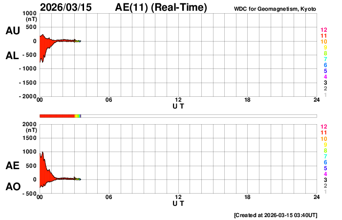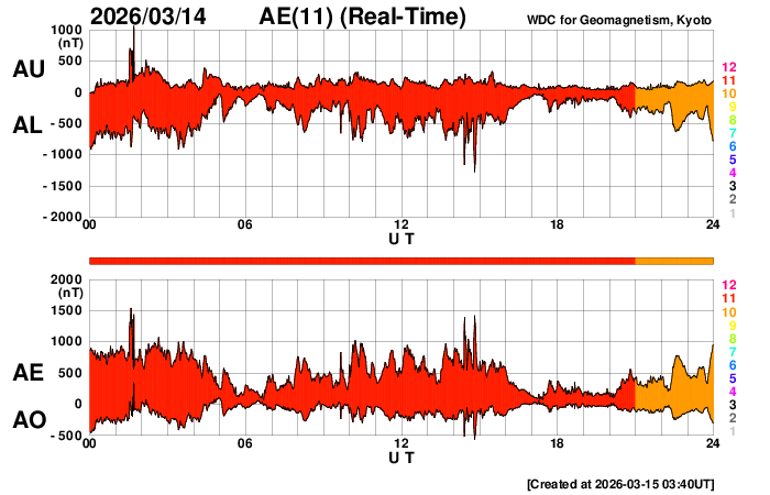 2026/ 3/15 12:54 更新 太陽風は650km/秒の高速風が続いています。磁気圏も活動的です。 担当 篠原 太陽風の速度は、昨日のニュースの後に650km/秒へ再び高まり、 その後、700km/秒まで上がりました。 今日の未明から少し下がっていますが、 現在も650km/秒とかなり高まった状態が続いています。 磁場強度は、12nTと強まった状態から 5nTと平均的な値へ下がっています。 高速風の領域としては中盤に入ったと言えそうです。 磁場の南北成分は、 グラフの途中から北寄りに変わっています。 磁気圏の活動は続いていて、 AE指数は1000nTに達する大きい変化が度々発生しています。 ただし、AE指数のグラフの最後は変化がなくなっています。 この後は活動の規模が小さくなりそうです。 GOES衛星SUVI 195では、 コロナホールは太陽の西側(右側)から南東(左下)へ 細長く伸びています。 27日周期の図の前周期の写真と比較すると、 広がりは細くなっています。 このため、この後の太陽風速度の高まりは、 前周期よりも弱くなるかもしれません。 注目して下さい。 太陽は、北西の端(右上)でC1の小さい変化が多く発生しています。 こちら側の領域では、 中心部北東(左上)の4393黒点群でC1.5、C1.7、 南東の4395群でC2.4の小規模フレアが発生した程度です。 ![]() GOES衛星のSUVI 195カメラによる太陽コロナの様子 (c) NOAA/SWPC ![]() SDO衛星による太陽の可視光写真(SOHO衛星の画像ページより取得)。 マウスの矢印を写真に重ねると、黒点番号付きの写真に切り替わります。 (c) SDO (NASA) ![]() ACEが観測した太陽風の磁場(黒線は全体の強度、赤線は南北成分) 磁場の向き、プラズマの密度、速度、温度 (c) データ:NOAA/SWPC、作図:宇宙天気ニュース ![]() AE指数(速報値) 下段のAEグラフの値が高くなると、オーロラ活動が活発化しています。 (c) 京都大学WDC ![]() ![]() 27日の太陽周期に合わせた図 太陽が同じ面を地球に向けていた27日前の変化から、今後を予想することができます。 (c) 作図:宇宙天気ニュース