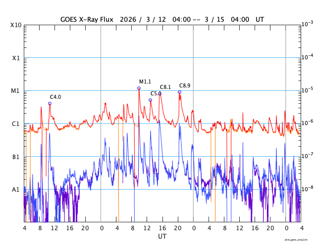 GOES衛星の太陽X線強度。赤・橙 = 0.1〜0.8 nm、青・紫 = 0.05〜0.4 nm (c) データ:NOAA/SWPC、作図:宇宙天気ニュース ![]() | |||||||||||||||||||||||||||||||||||||||||||||||||||||||||||||||||||||||||||||||||||||||||||||||||||||||||||||||||||||||||||||||||||||||||||||||||||||||||||||||||||||||||||||||||||||||||||||||||||||||||||||||||||||||||||||||||||||||||||||||||||||||||||||||||