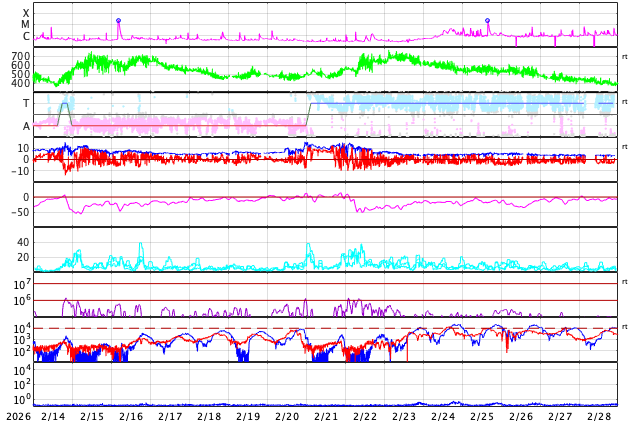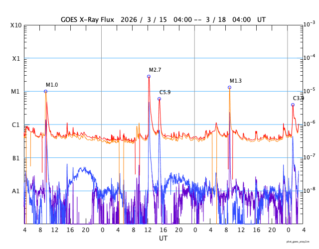 GOES衛星の太陽X線強度。赤・橙 = 0.1〜0.8 nm、青・紫 = 0.05〜0.4 nm (c) データ:NOAA/SWPC、作図:宇宙天気ニュース ![]() | |||||||||||||||||||||||||||||||||||||||||||||||||||||||||||||||||||||||||||||||||||||||||||||||||||||||||||||||||||||||||||||||||||||||||||||||||||||||||||||||||||||||||||||||||||||||||||||||||||||||||||||||||||||||||||||