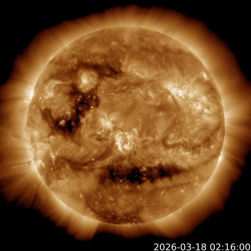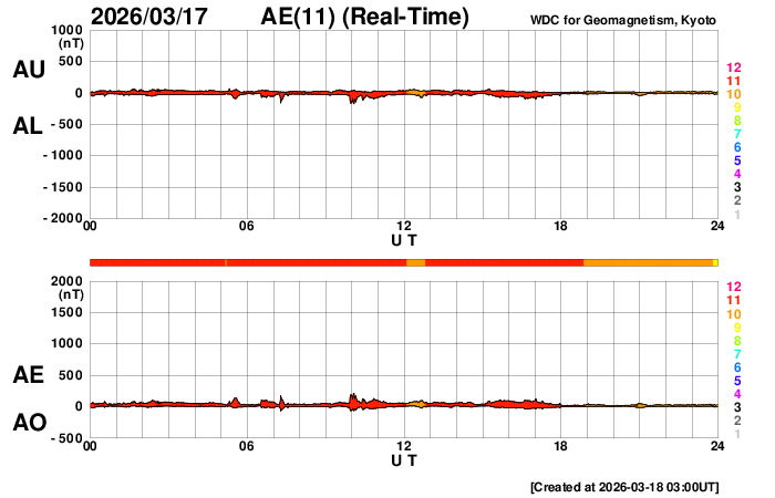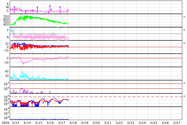 2026/ 3/18 12:08 更新 高速太陽風が終わって、速度は420km/秒に下がっています。磁気圏は穏やかです。 担当 篠原 太陽風の速度は、500km/秒から420km/秒へ下がり、 平均的な速度に戻っています。 磁場強度は、4nT前後と平均的な状態で推移しています。 磁場の南北成分は、弱い北寄りになっています。 磁気圏は穏やかで、AE指数はほとんど変化がなくなっています。 GOES衛星SUVI 195を見ると、 中心部の南側でコロナホールが東西に伸びています。 太陽風の速度は下がりましたが、 この領域の影響で再び高まる可能性があります。 また、北東側(左上)にもコロナホールが見えていて、 5日後くらいからこちらの影響が始まりそうです。 そして、昨日のニュースで紹介した、 16日夜に発生したCME(コロナ質量放出)による 太陽風の乱れが明日くらいに到来しそうです。 磁場の強まりがやって来て、 南向きに大きく変化すると磁気圏の活動は強まります。 どの様な乱れがやって来るか、注目して下さい。 太陽は、中心部南側の4392黒点群で、 M1.3の中規模フレアとC3.9の小規模フレアが発生しています。 特に活発という様子ではありません。