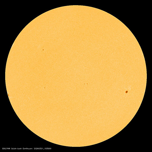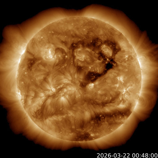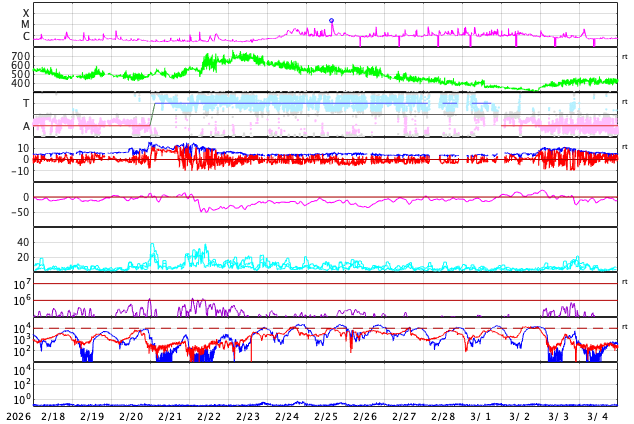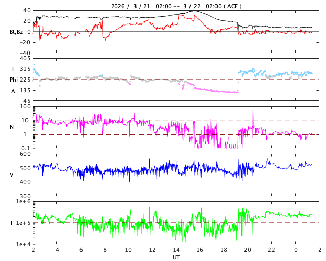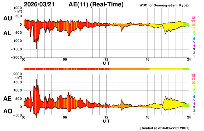 2026/ 3/22 10:40 更新 太陽風は500km/秒と高速の状態が続いています。 担当 篠原 太陽風は、500km/秒と高速の状態が続いています。 磁場強度は、昨日のニュースの後35nTに強まり、 グラフの途中では、40nTに達する変化も発生しています。 その後は下がって行って、現在は8nTとやや強まった程度に戻っています。 ひと段落着いた印象ですが、かなりの強まりが到来しました。 太陽風磁場の南北成分は、 グラフの前半で -10nT程度の強い南向きの変化が発生しています。 磁気圏の活動も強まって、 AE指数は1500nTに達する大きい変化が発生して、 その後も800nTの中規模の活動が続きました。 その後、磁場の南北成分は北向きに強まる様になり、 +30nTというかなり大きい変化も発生しています。 しかし、北向きになると磁気圏への影響は弱まるため、 AE指数は変化が小規模になっています。 そして、太陽風のグラフの後半になると、 南北成分は0nT付近で小さく南北に変化する様になり、 磁気圏の活動はやや強まって、 AE指数は500nTの変化が発生しています。 磁場強度は下がりましたが、太陽風の速度は高まった状態です。 GOES衛星SUVI 195を見ると、 北半球のコロナホールは全体が西側(右側)に進んだくらいで、 3〜4日くらいは影響が続く可能性があります。 太陽は、X線グラフは目立った変化はなく、 穏やかな状態が続いています。